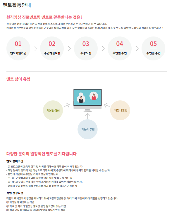 아는 지인으로부터 연락이 와서 하게 되었는데 초, 중학생들에게 다양한 직업인들을 통해 어린 친구들에게 간접 경험을 하게 한다는 점에서 취지도 좋고, 향후 진로설정에 있어서 긍정적인 도움이 되었으면 좋겠다는 바람으로 강연을 만들었다. 내가 중학생 때에는 이런 강연이나 활동이 거의 없었던 기억이 있는데 어렸을 때의 경험이 가장 중요하다고 생각하는 입장이다. 사실 성인이 되어서는 내가 관심 있고 좋아하는 일이 있더라도 재고따지게 되는 경우가 많은데 어렸을 때는 순수하게 내가 좋아하는 일에 관심을 갖고 그 방향으로 나아갈 동기부여가 크다고 생각한다. 그렇기 때문에, 간접적으로 다양한 직업군에 대해 체험할 수 있다는 것만으로도 학생들에게 향후 진로선택에 있어서의 폭이 넓어질 수 있을 것이란 생각이 들었고, 좋은 강연을 만들고 싶다는 생각에 멘토링에 참여하게 되었다.