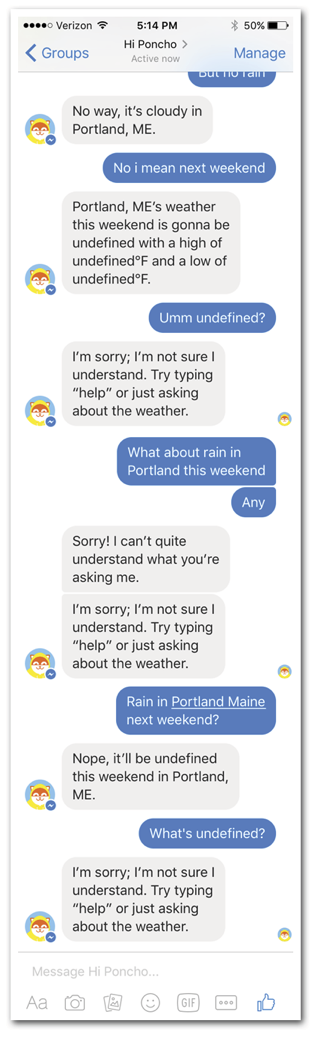 첫째, 현재 AI 기반의 Chat Bot 기술 수준은 아주 기초적인 User의 Q&A에 대해서도 잘못된 응답을 내놓는 일이 허다한 수준이므로 Chat Bot을 통한 고객의 은행거래 처리는 최소 2~3년이 지난 후에 고려해도 늦지 않다. 보고서에 첨부되어 있는 아래의 페북메신저의 Poncho Bot 사례가 현재Chat Bot의 수준을 보여준다고 할 수 있겠다.