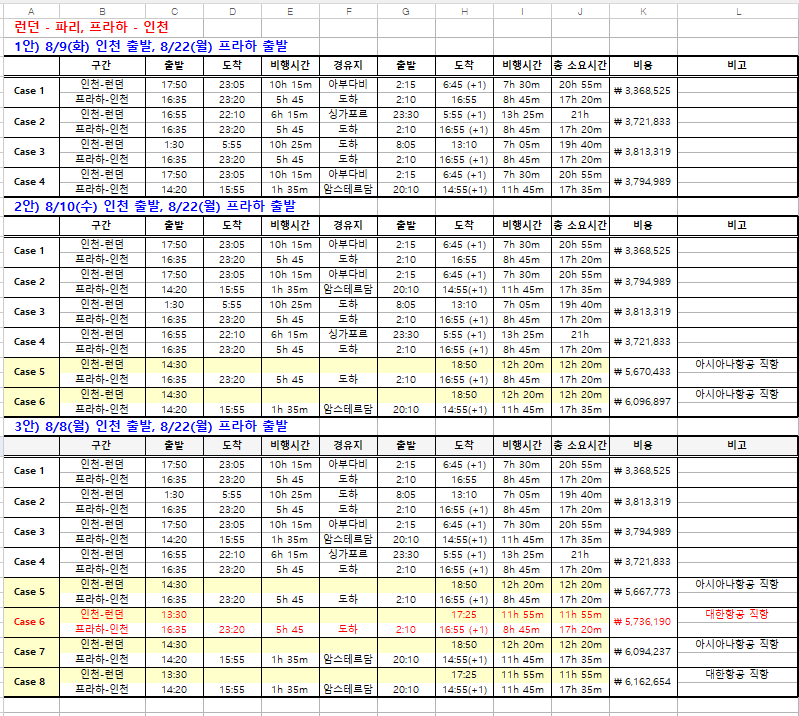 여행준비도 일처럼 꼼꼼히 준비해준 남편님이 보내준 비행기 시간 선택지 일부... 1,2,3안도 아닌 8월7일 밤 비행기로 결정!!