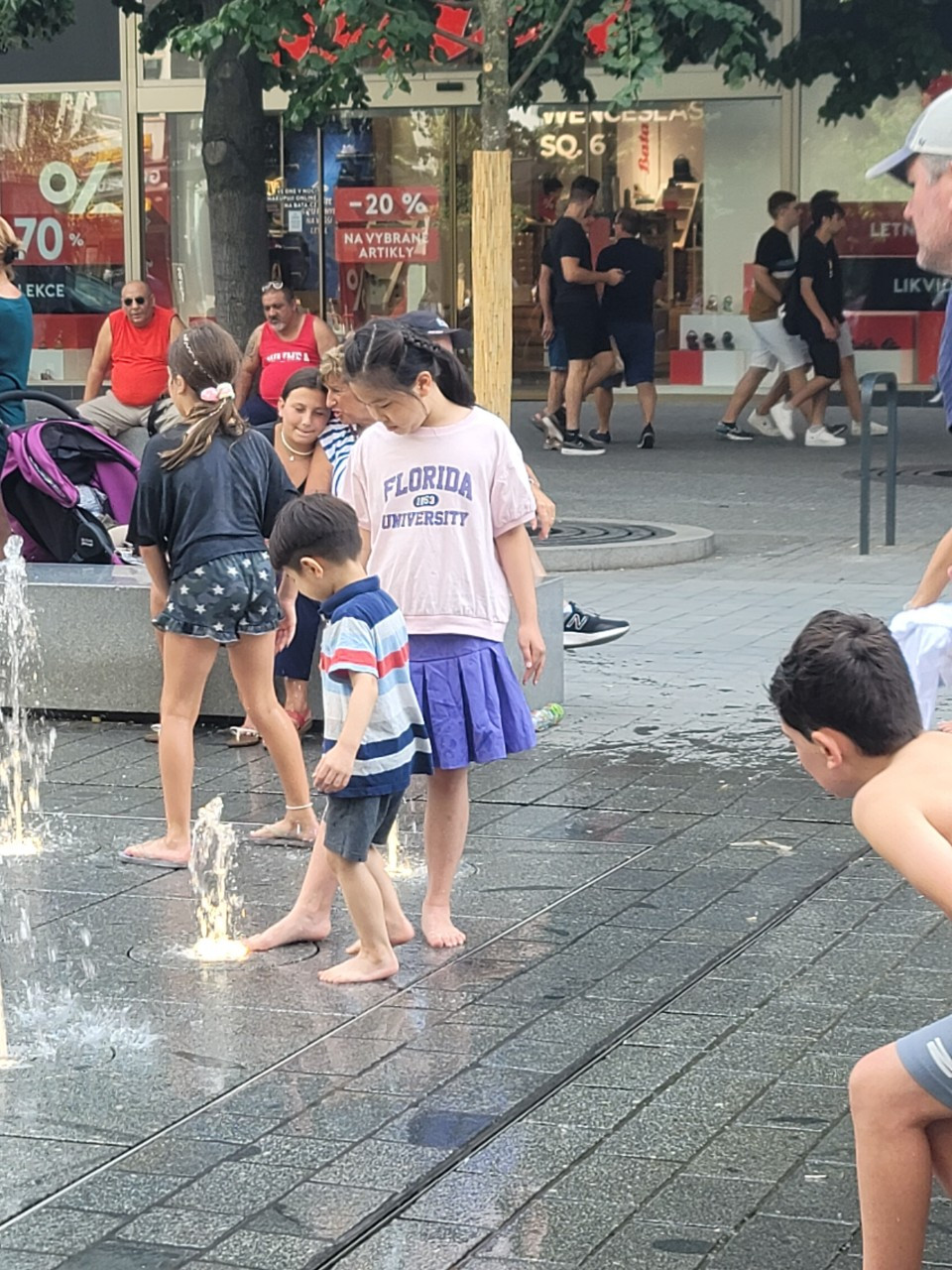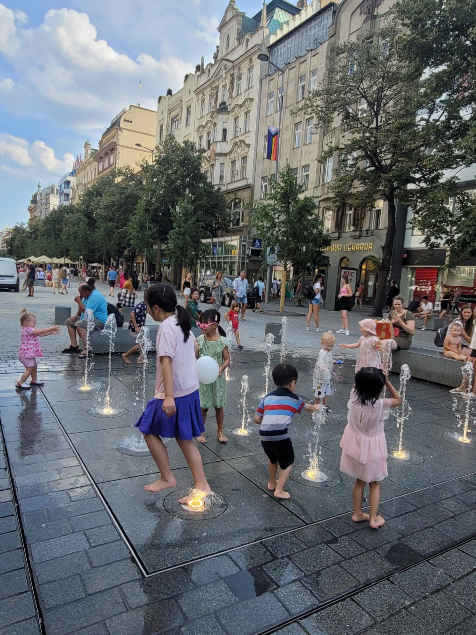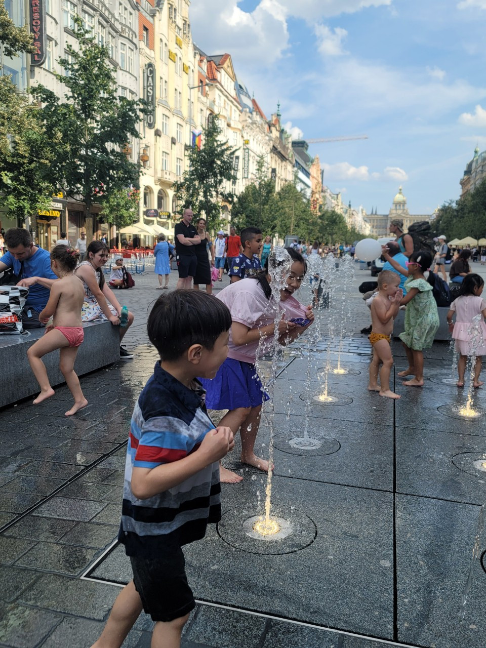 아이들이 바츨라프 광장 바닥분수에서 깔깔깔 신나게 놀고 있다.