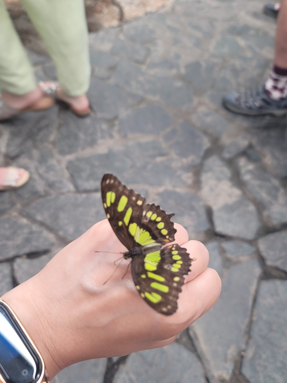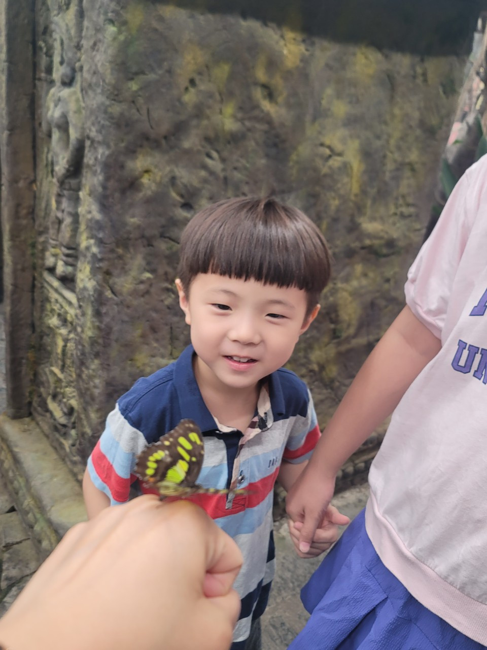 나비가 이리도 사람 친화적인 곤충이었던가. 사람들이 손을 내밀면 다가와 앉았다. 어떤 사람은 머리에도 등에도 나비가 붙어있었다. 다인이는 그런 사람들을 부러워하면서도, 본인이 해보기에는 겁이 났는가보다. 자꾸 엄마가 해보라고 등을 떠밀었다. (사실, 나도 곤충을 그리 좋아하지 않아...ㅠㅠ) 그치만, 용기를 내서 나비에게 손을 내밀어 보았다. 나비 한마리가 날아와 내 손등에 앉아주었다. 나는 간질간질하기도 하고, 기분이 이상했지만, 아이들 보라고 꾹 참고 가만히 있었다. 역시나 아이들은 신기함과 두려움을 동시에 가진 표정으로 나비들을 관찰했다.
