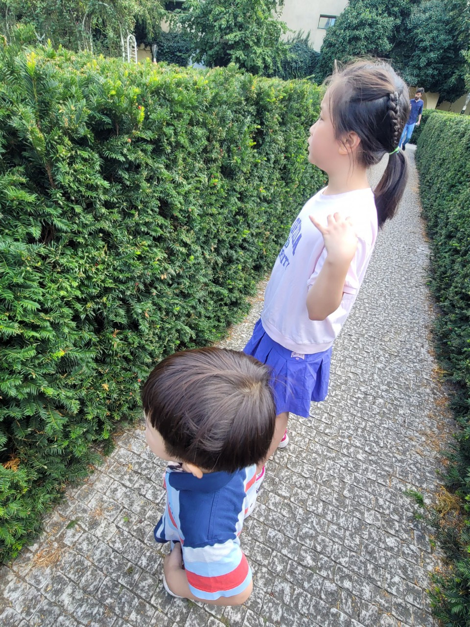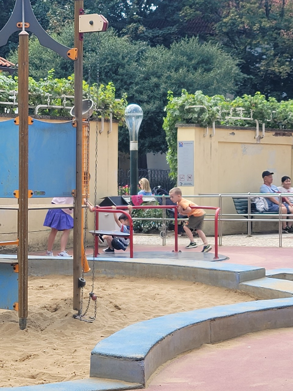 공원 한쪽에서 아이들 웃음소리와 울음소리가 뒤섞인, 특유의 놀이터 소음이 들려왔다. 아이들은 꽃이든 나무든 조각상이든 관심없고, 놀이터로 직진이다. 벤치에 앉아 노는 모습을 조금 지켜보다보니, 이 정원 골목에 들어서기 전에 보았던 스타벅스가 간절해지기 시작했다. 아이들은 놀이터에서 놀고 있으라 하고 잠시 스타벅스를 다녀왔다. 주문 줄을 기다리느라, 애들만 놀이터에 두고온 사실이 조금씩 초조해졌다. 서둘러 발길을 돌려 종종걸음으로 놀이터로 돌아왔더니, 그새 놀이터에 있던 다른 아이들도 같이 섞여 놀고있었다. 언어가 통하지 않아도, 그저 재밌게 놀고 싶은 마음은 하나다.