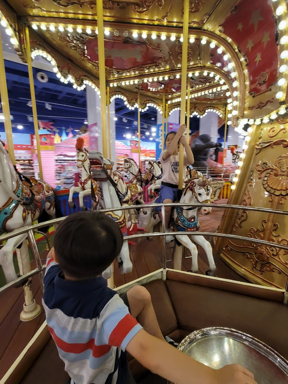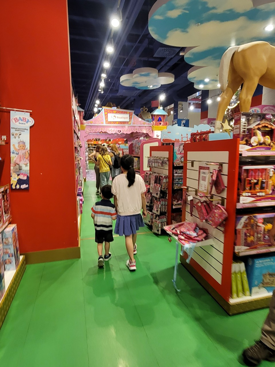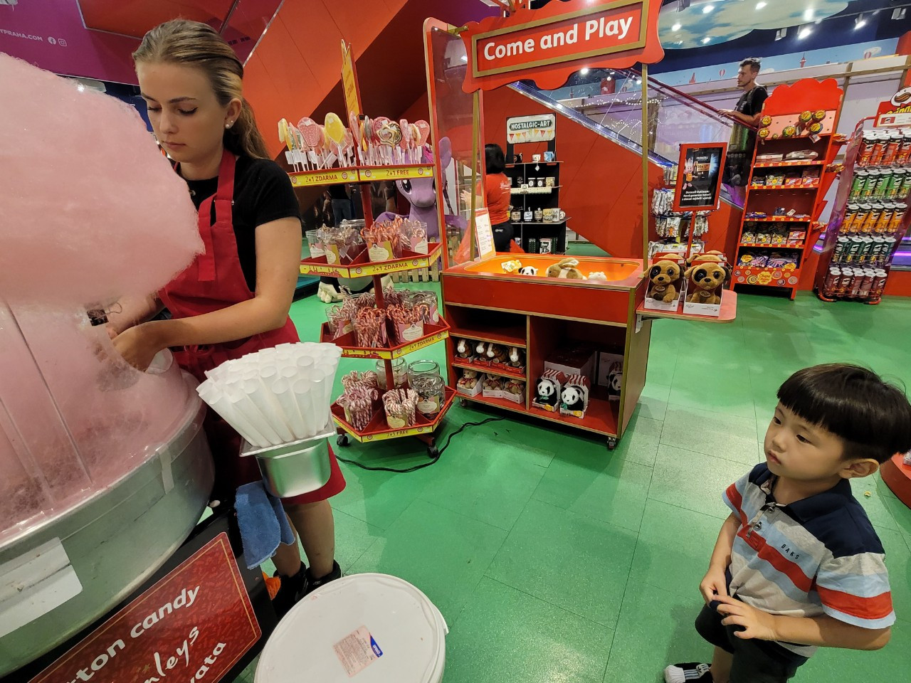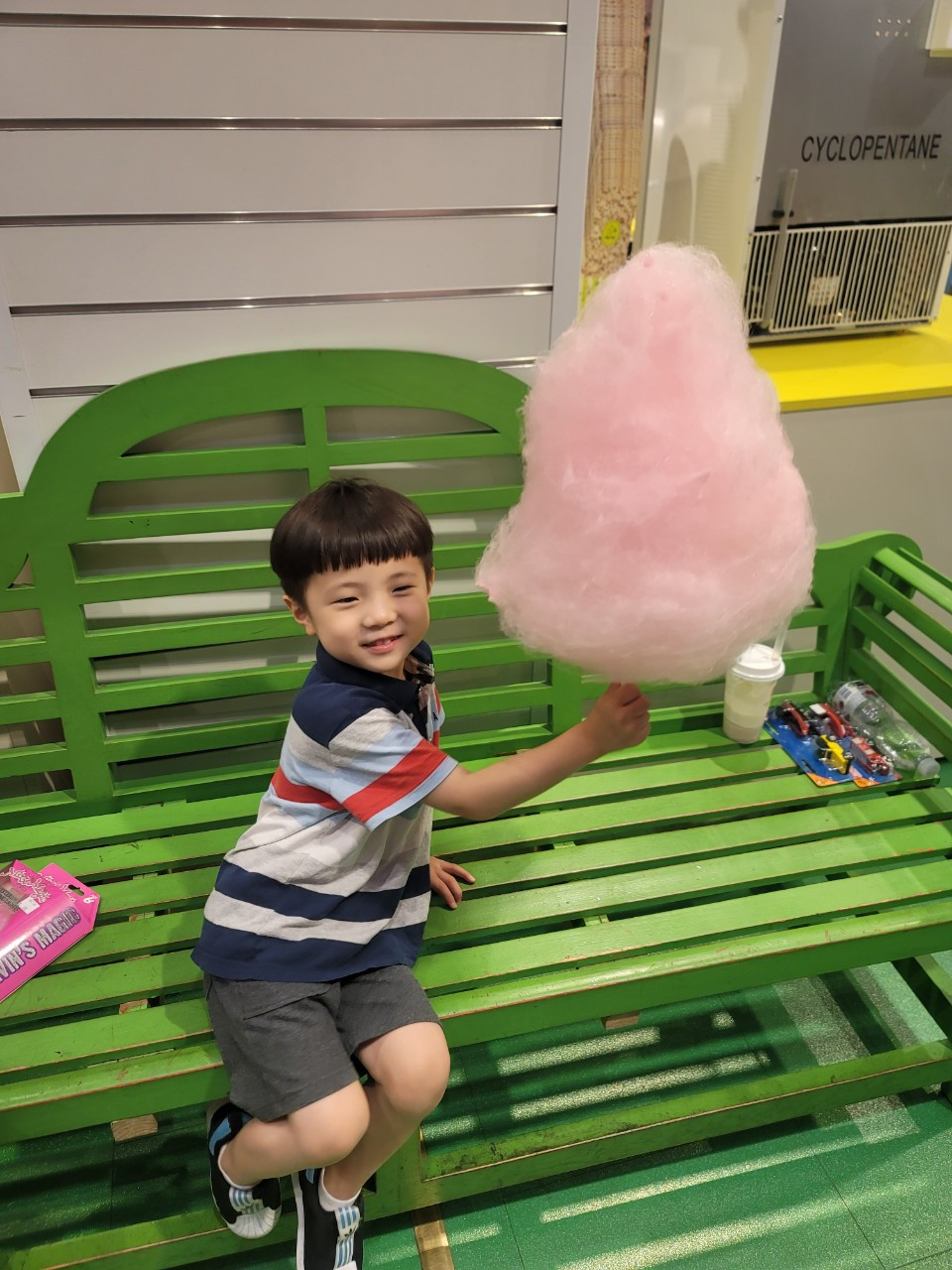 솜사탕을 먹으며 잠시 행복했지만, 누나처럼 손에 남는 장난감이 없었다. 솜사탕은 누나랑 엄마랑 같이 나눠먹었기에, 장난감을 못사게 된 민찬이에게도 누나꺼보다는 조금 저렴한 다른 장난감 하나를 골라주기로 했다. 민찬이 장난감 고르는 게 생각보다 어렵고 까다로웠다. 맘에 딱 드는 게 없었는데, 안사기는 아쉬웠기 때문에 계속 여기저기를 돌아다니며 고심을 했다. 결국 퍼페트롤 캐릭터가 그려진 목욕놀이 장난감을 하나 샀다. 이 장난감은 지금도 목욕할 때마다 잘 가지고 놀고 있다. (누나는 마술손가락 사고 한국와서 한두번 해봤나?! 꺼내보지를 않는데 말이다)