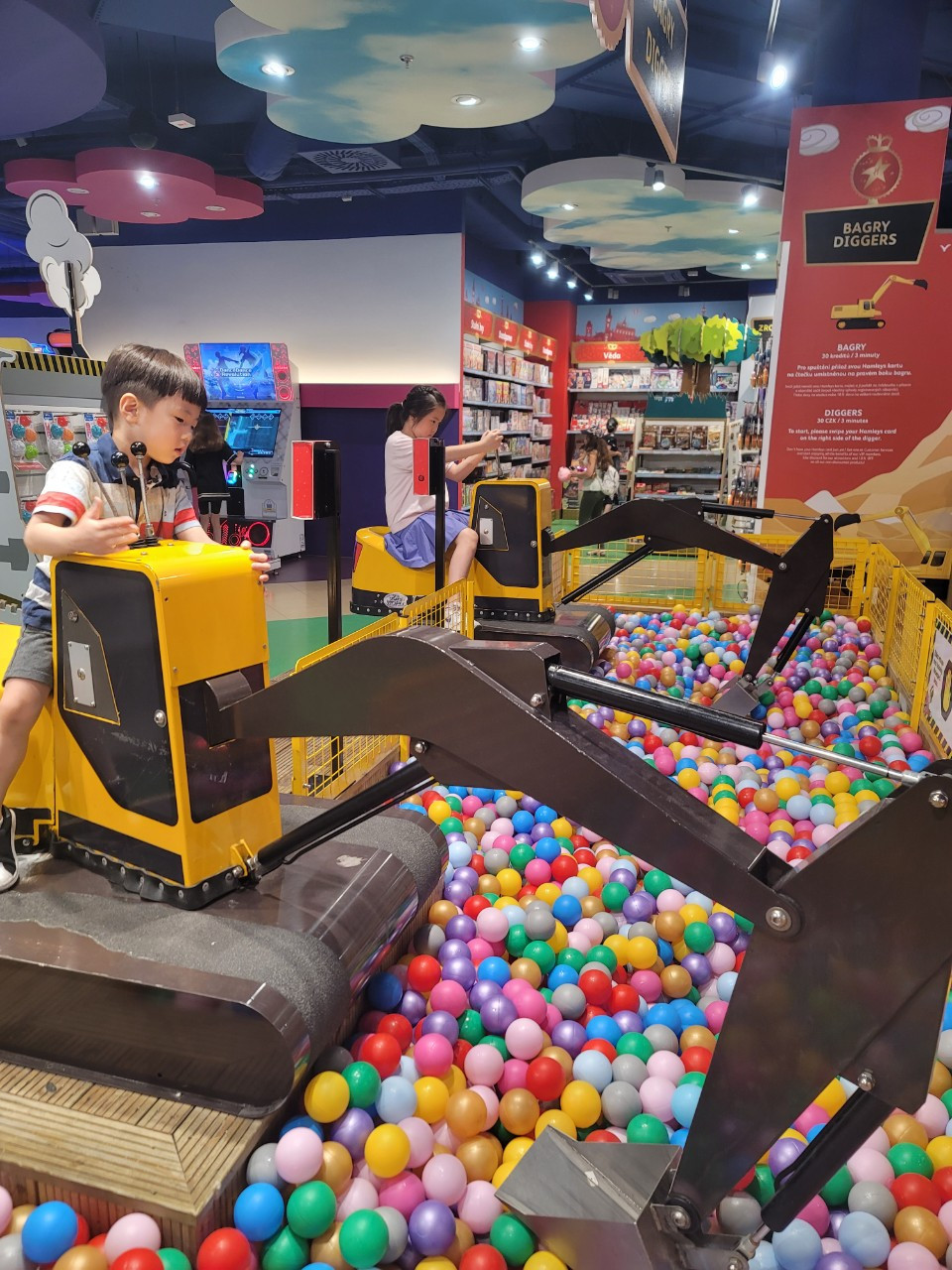 중장비 마니아 민찬이는 실제로 포크레인을 조종해서 볼풀을 옮길 수 있는 이 기구를 굉장히 좋아했다. 물론 공짜는 아니었다. 움직이지 않는 포크레인에 앉아보는 건 무료지만, ;; 이 기계를 움직여서 볼풀을 뜨려면 결제를 해야 했다. 아이들은 당연히!! 너무나 기계를 움직여 보고 싶어했다. 1층 계산대에서 햄리스 카드를 사서 일정금액을 충전해서, 찍고 사용하는 방식이었다. 아이들은 포크레인, 회전목마를 꼭 타고 싶어해서 그 비용을 계산해서 금액을 충전했다. 정확한 비용은 기억이 나지 않지만, 카드에 대략 1~2만원 사이 정도의 금액을 충전했던 것 같고, 물론, 다 탕진하고 왔다! (키즈카페 맞네!!)
