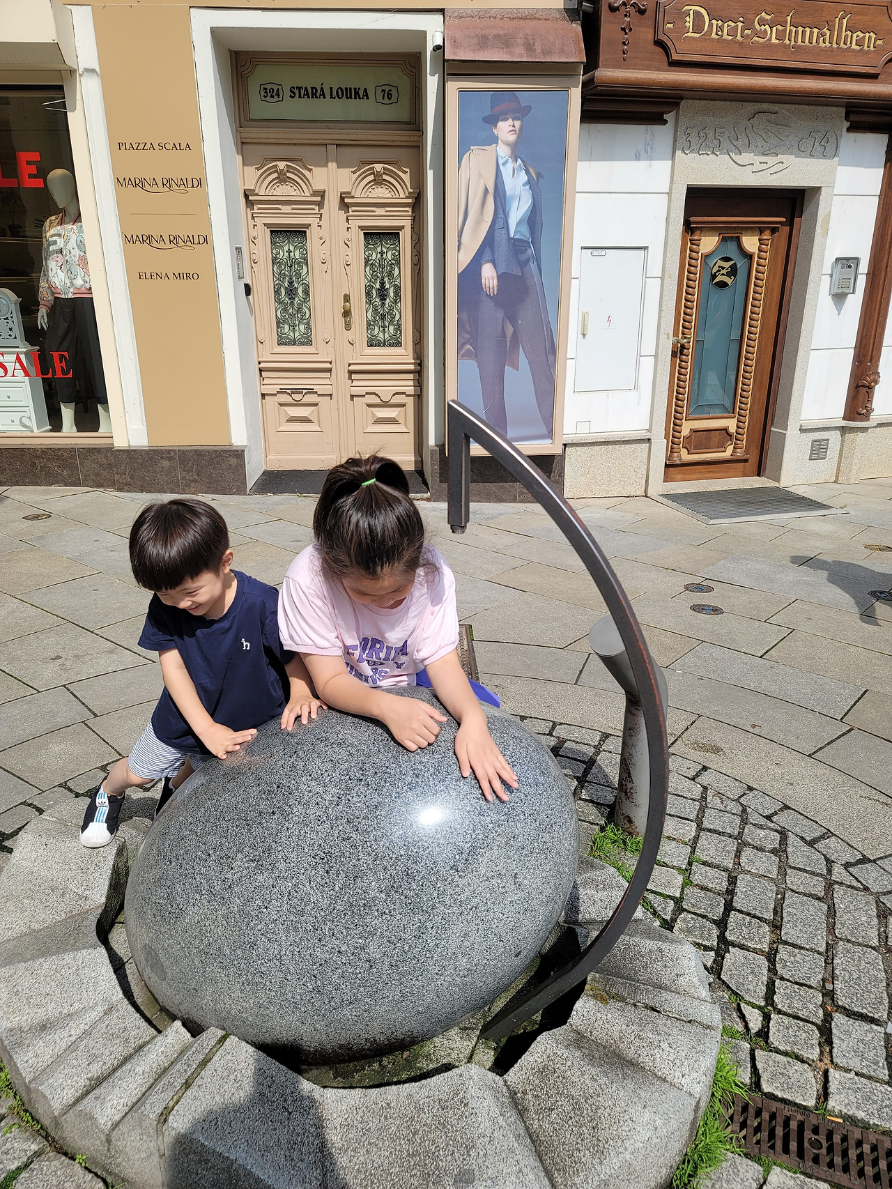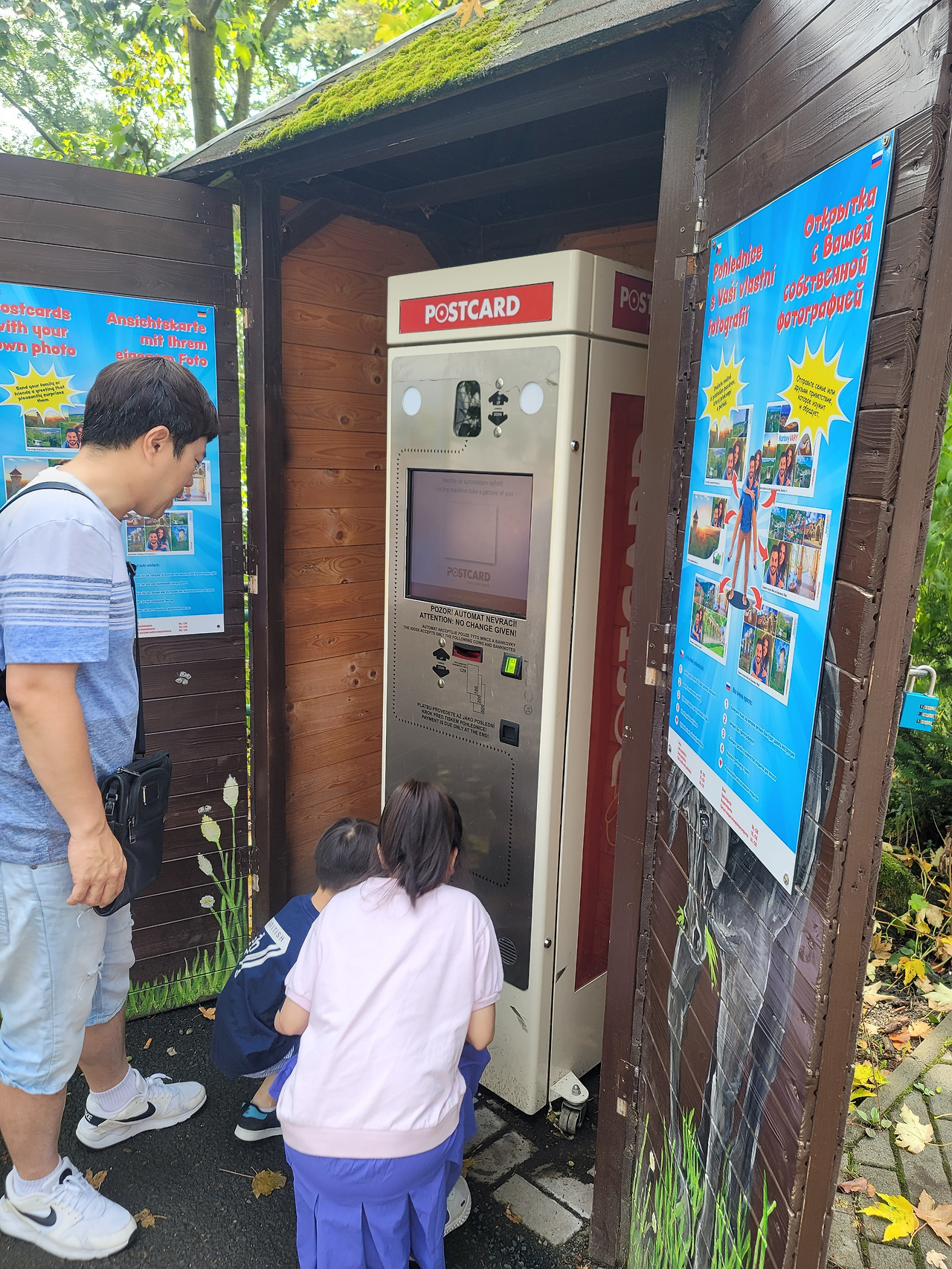전망대, 미니 놀이터, 미니 동물원을 둘러보고, 아래로 내려가는 푸니쿨라를 타러 가는 길에, 까를로비바리의 풍경을 배경으로 하는 즉석사진기가 있었다. 우리는 까를로비바리 여행 기념으로 가족사진을 남기기로 했다.