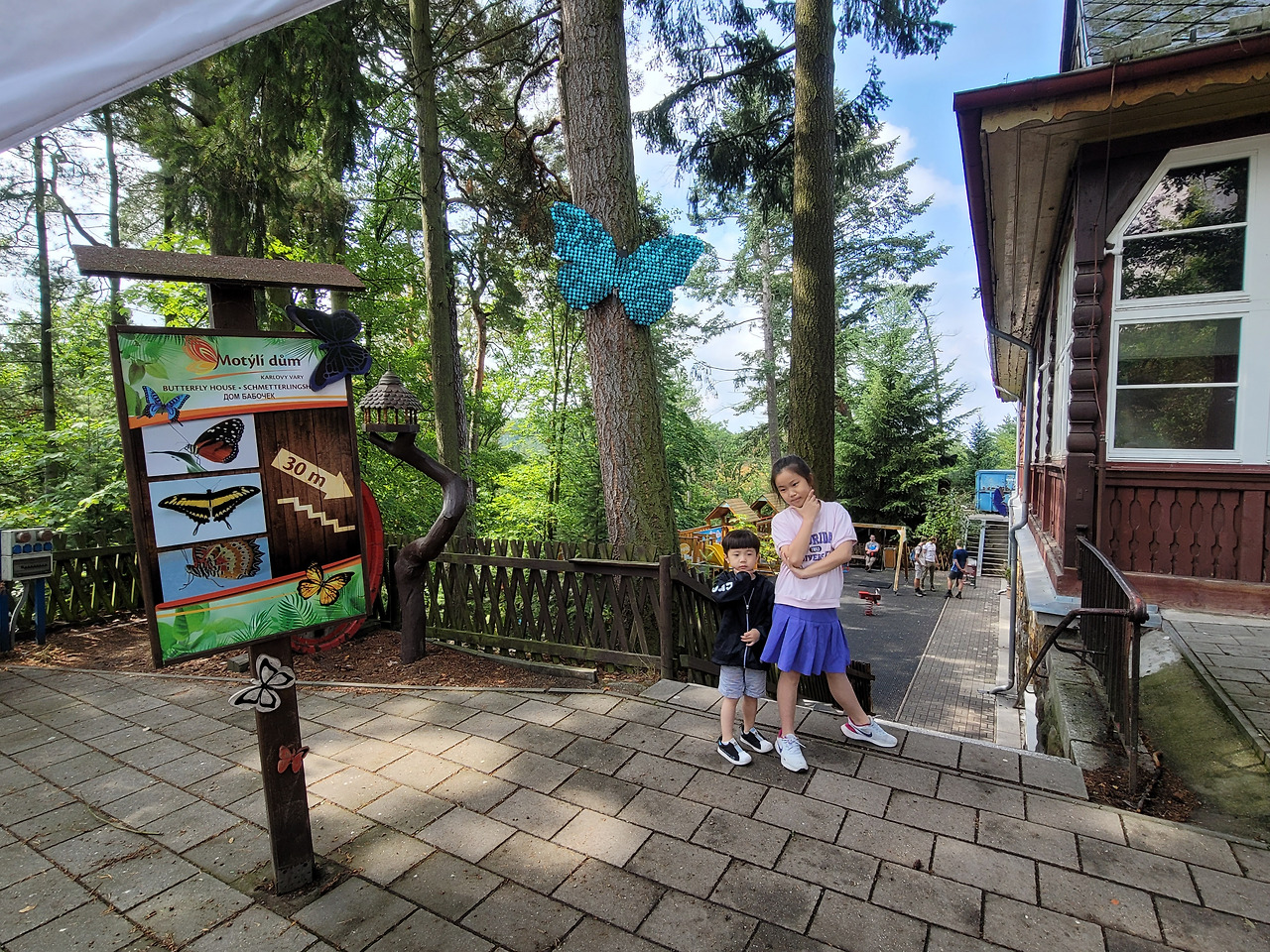 전망대를 한 바퀴 돌고, 뒤편에 있는 공원으로 나가보니, '버터플라이 하우스'가 있었다. 우리는 바로 며칠 전, 프라하 시내에 있는 햄리스에서 이미 '버터플라이 하우스'를 방문했었다. 아이들은 나비를 좋아하면서도 징그러워했고, 결국 비싼 티켓값에 비해 오래 머물지 못하고 나왔던 기억이 있다. 까를로비바리 전망대에도 나비하우스가 있었다니!! 체코 사람들은 나비를 정말 좋아하나 보다...?!