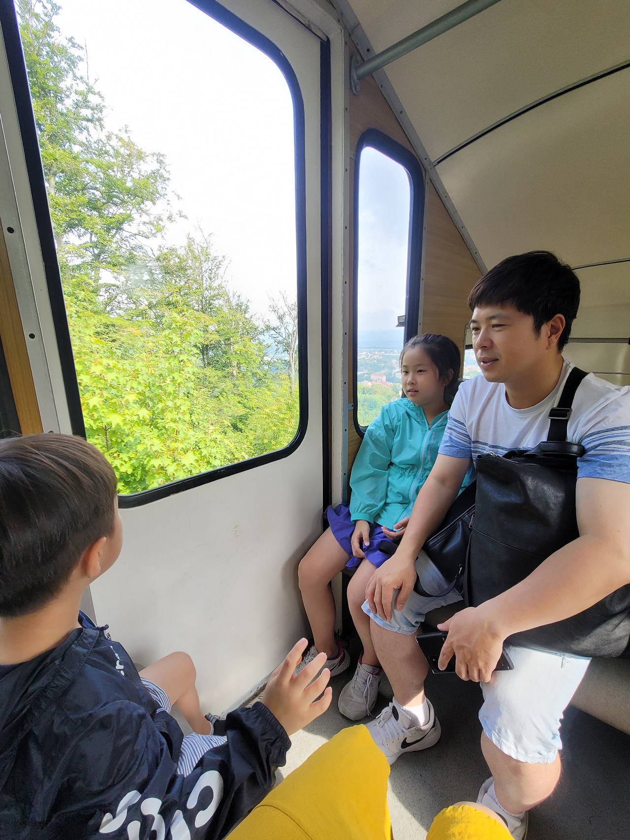 호텔 바로 뒤편 전망대 초입에 푸니쿨라(등산 열차)를 타는 곳이 있었다. 우리가 타러 갔을 때는 사람이 거의 없었는데, 다 구경하고 내려올 때 보니, 줄이 저~~뒤에까지 이어져있었다. 오픈 시간에 맞춰 일찍 다녀오길 잘했다!! 푸니쿨라는, 영화 <그랜드 부다페스트 호텔>에서 산기슭에 위치한 호텔에 올라가는 열차와 비슷하게 생겼다. 경사면 기울기대로 디자인되어 내부가 지붕 밑 다락방 같은 느낌도 들었다.