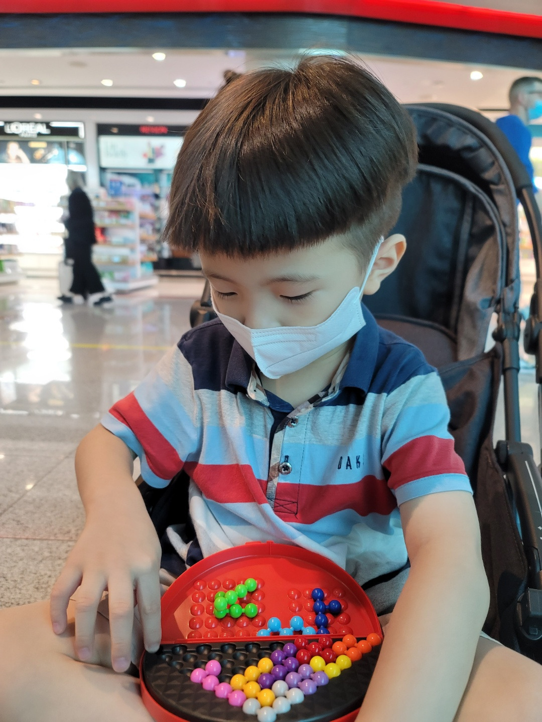 맥도널드에서 감자튀김을 먹고 앉아 쉬다가 너무 오래 앉아있는 것 같아서 아이들을 데리고 나와 하릴없이 공항을 몇 바퀴 돌고, 어느 한가로운 벤치에 자리를 잡았다. 심심한 건 못 버티는 우리 아이들... 다인이는 태블릿으로 넷플릭스에서 다운로드하여놓은 영상들을 보고, 민찬이는 한국에서 챙겨 온 보드게임을 했다. (누나가 1학년 때 학교에서 받아온 퍼즐인데, 요즘 민찬이가 부쩍 관심을 보이고 재미있어해서 혹시나 심심할 때 하자 하고 챙겨 왔는데, 틈날 때마다 저걸 했다. 와! 이거 챙겨간 나 자신! 칭찬해!! 마냥 혼자 하는 게 아니라, 문제 샘플을 보고 몇 개의 퍼즐을 세팅해주면 나머지를 맞추는 형식의 게임이라, 나도 졸린 눈 부릅뜨고 같이 옆에서 머리를 굴려줘야 했다 ^^;;