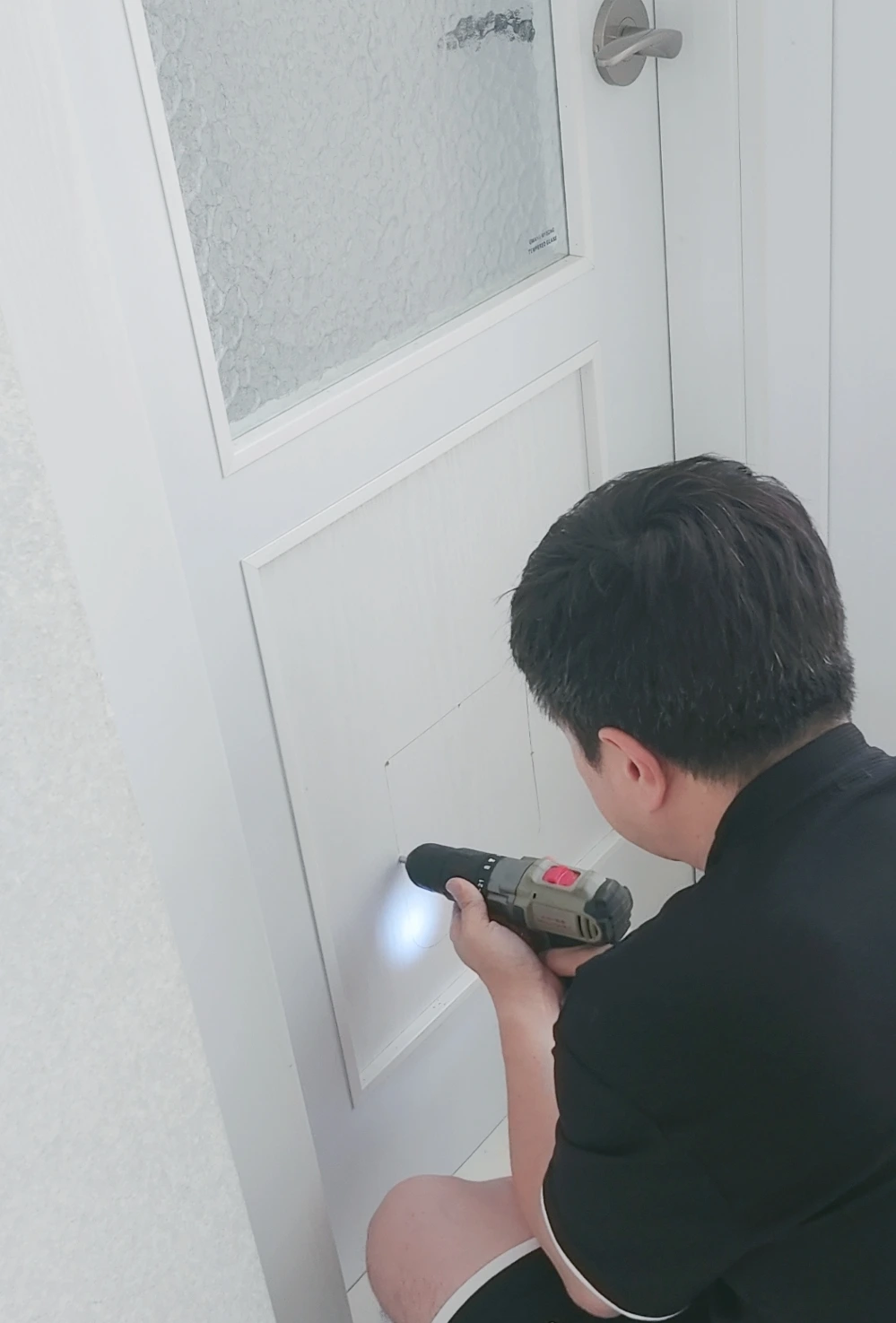 펫도어를 문에 대고 연필로 자를 곳에 밑그림을 그렸다. 그 선을 따라 드릴로 구멍을 다다다다 내기 시작했다. 남편은 톱질이 수월해지려면, 되도록 촘촘하게 많은 구멍을 뚫는 게 좋다는 걸 터득했다.