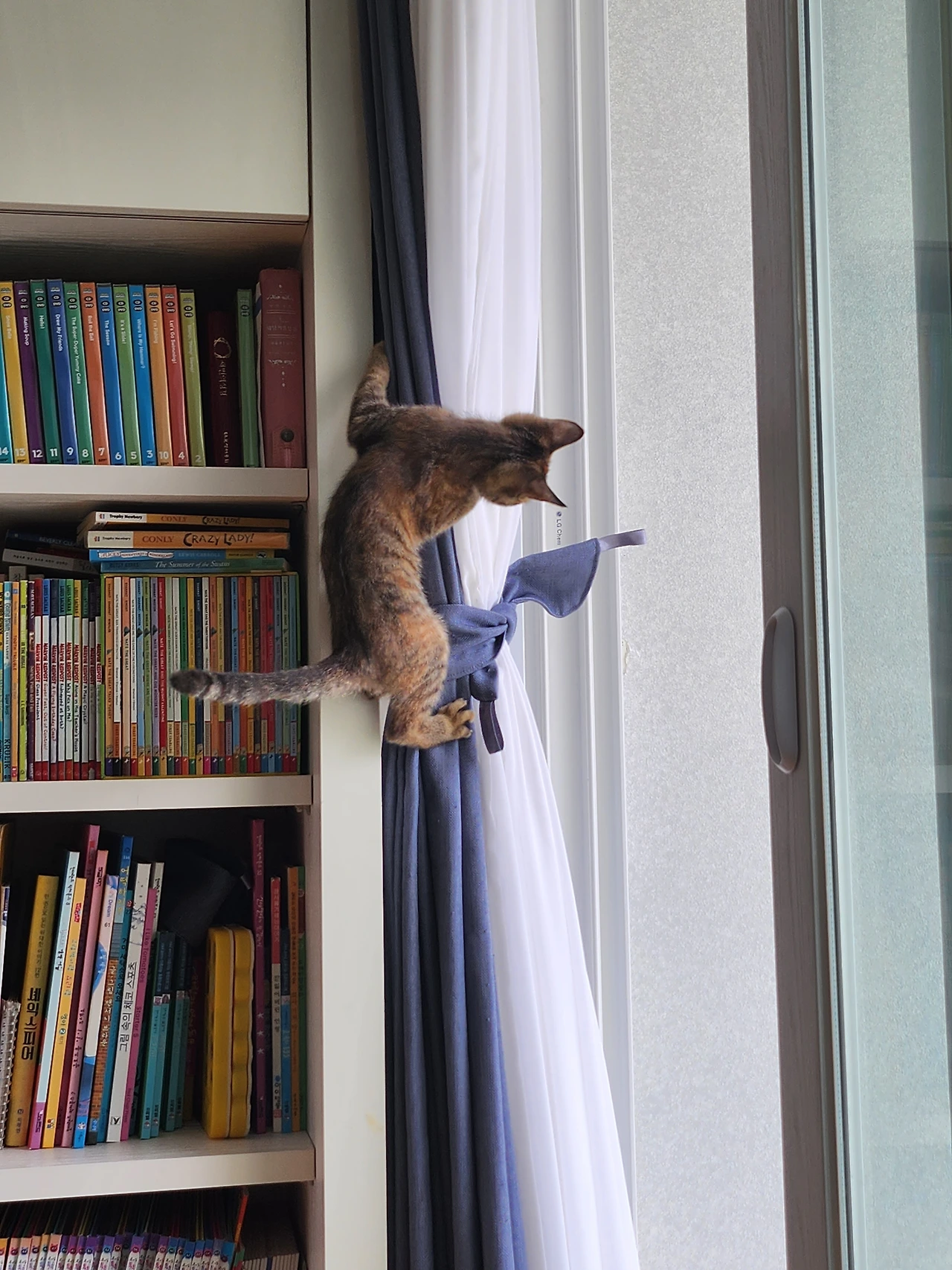 쫄보 초보 집사는 그런 고양이가 너무너무 신기하면서도, 이대로 뒀다가 혹여나 떨어졌을 때 신체에 가해질 타격이 두려워, 더는 두고 보지 못하고 몇 번을 안아서 끌어내렸다. 미처 내려주지 못했을 땐 어떻게 내려오나 궁금했었는데, 어느 날 우연히, 너무 쉽게 폴짝 가뿐히 땅으로 착지하는 걸 목격했다. 아니면, 올라갈 때처럼 드드득 드드득 발톱으로 커튼을 부여잡으면서 내려왔다.