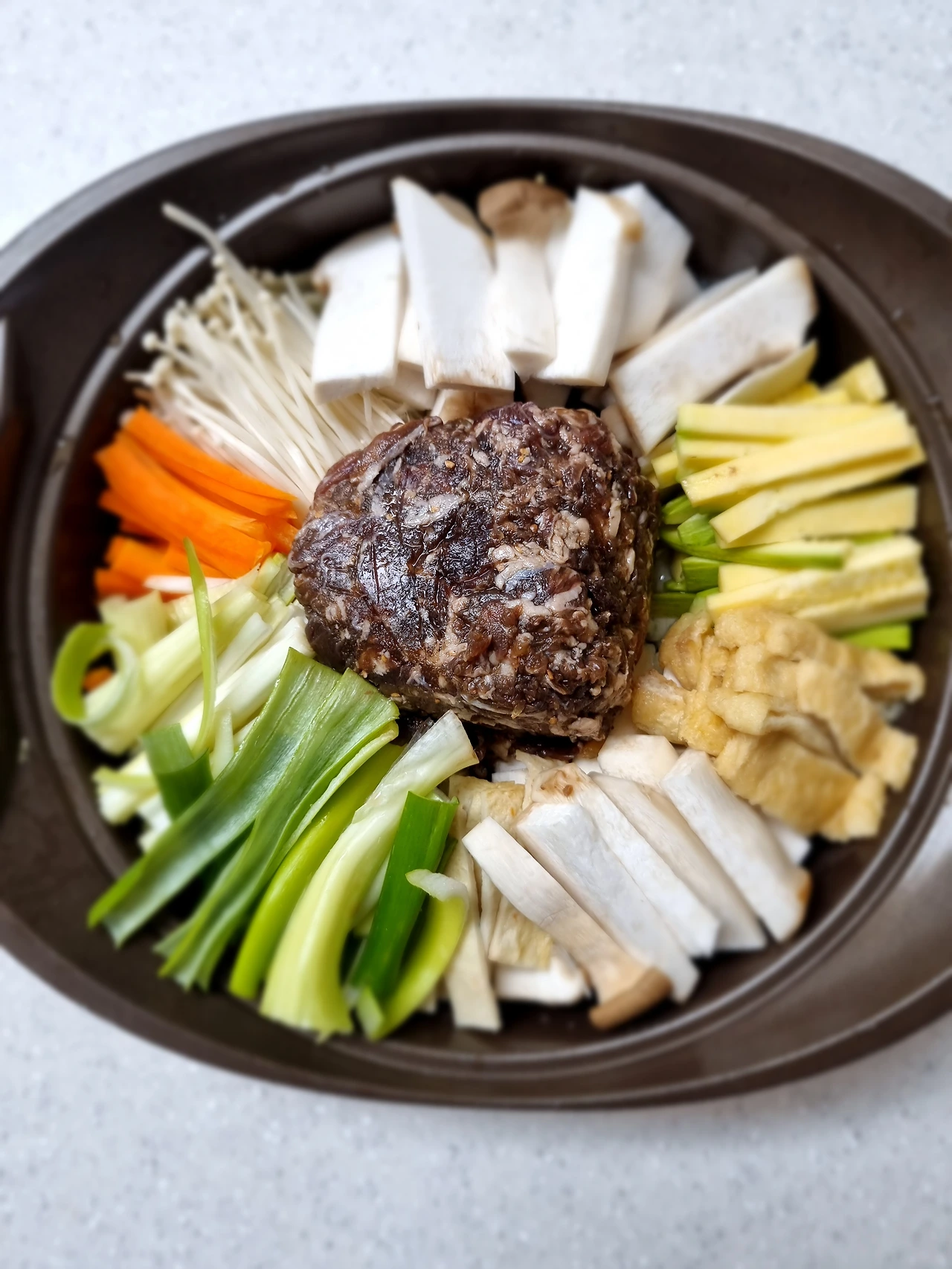 여름은 너무 더워서 반찬 하기 싫다는 핑계로 대충 먹고살았다. 내일은 11살 큰 아이 개학이라 오늘 저녁은 맛있는 거 먹고 싶다고 했다. 불고기 양념해서 소분해 놓은 것 냉동실에서 꺼냈다. 온갖 채소를 예쁘게 썰어서 놓았다. 가운데 불고기 넣었고 물을 부었다. 육수팩과 무는 냄비밑에 미리 깔았다. 세팅된 전골은 너무 예뻐서 사진을 찍었다.