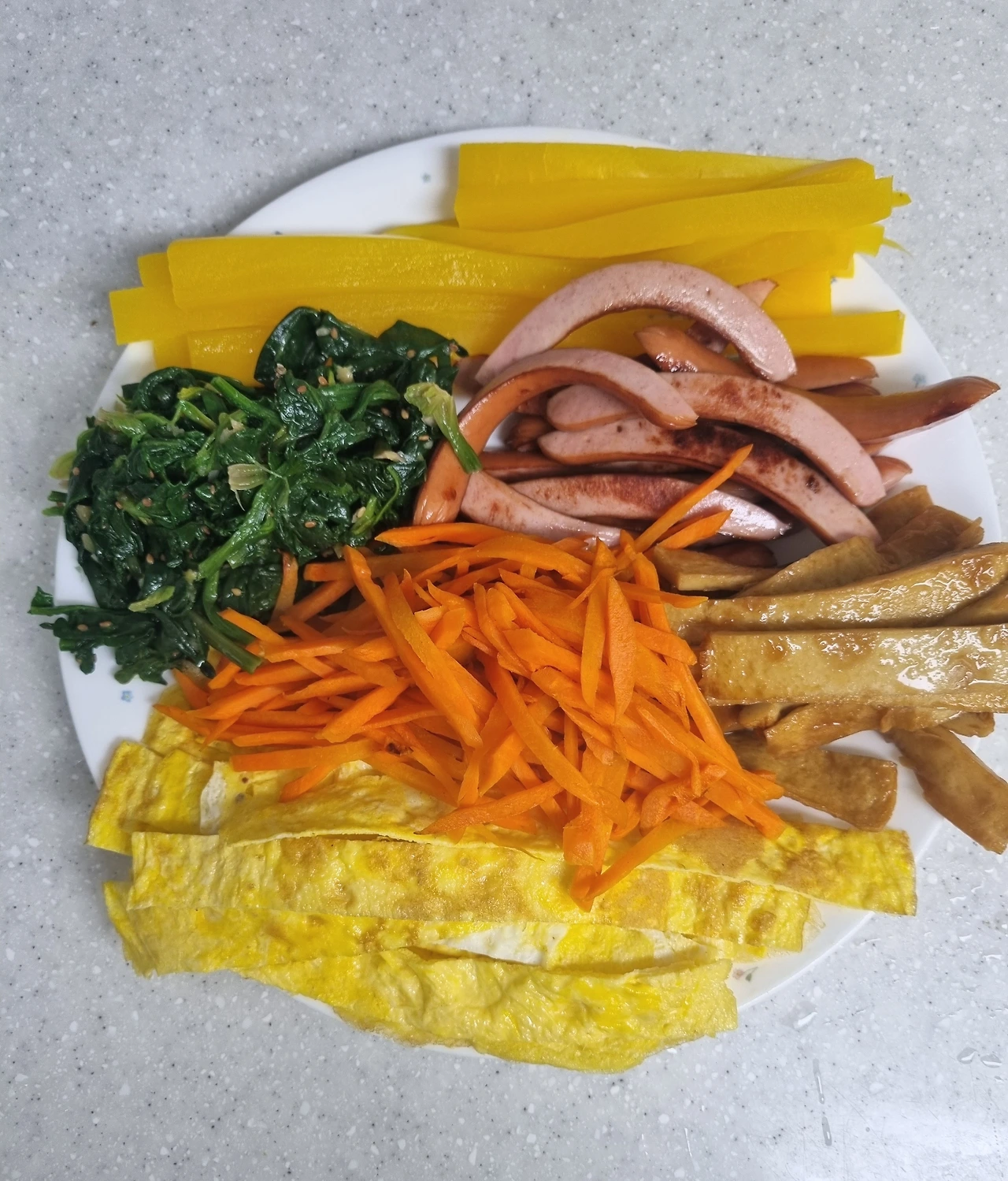 저번 달에 김밥 싸고 남은 통단무지의 3분의 1쪽이 보인다. 엄마가 무쳐주고 간 시금치나물이 있다. 계란은 늘 있으니까 됐다. 냉동실에 어묵과 김밥김은 상비약처럼 넣어두니 그것도 다행이다. 당근과 햄이 문제다. 당근은 반쪽밖에 없으니 일단 그거라도 넣고 되는대로 해보자. 햄은 없지만 세일한다고 샀더니 맛없다고 거들떠보지도 않던 소시지가 보인다. 이거다! 이거면 되는 거다!