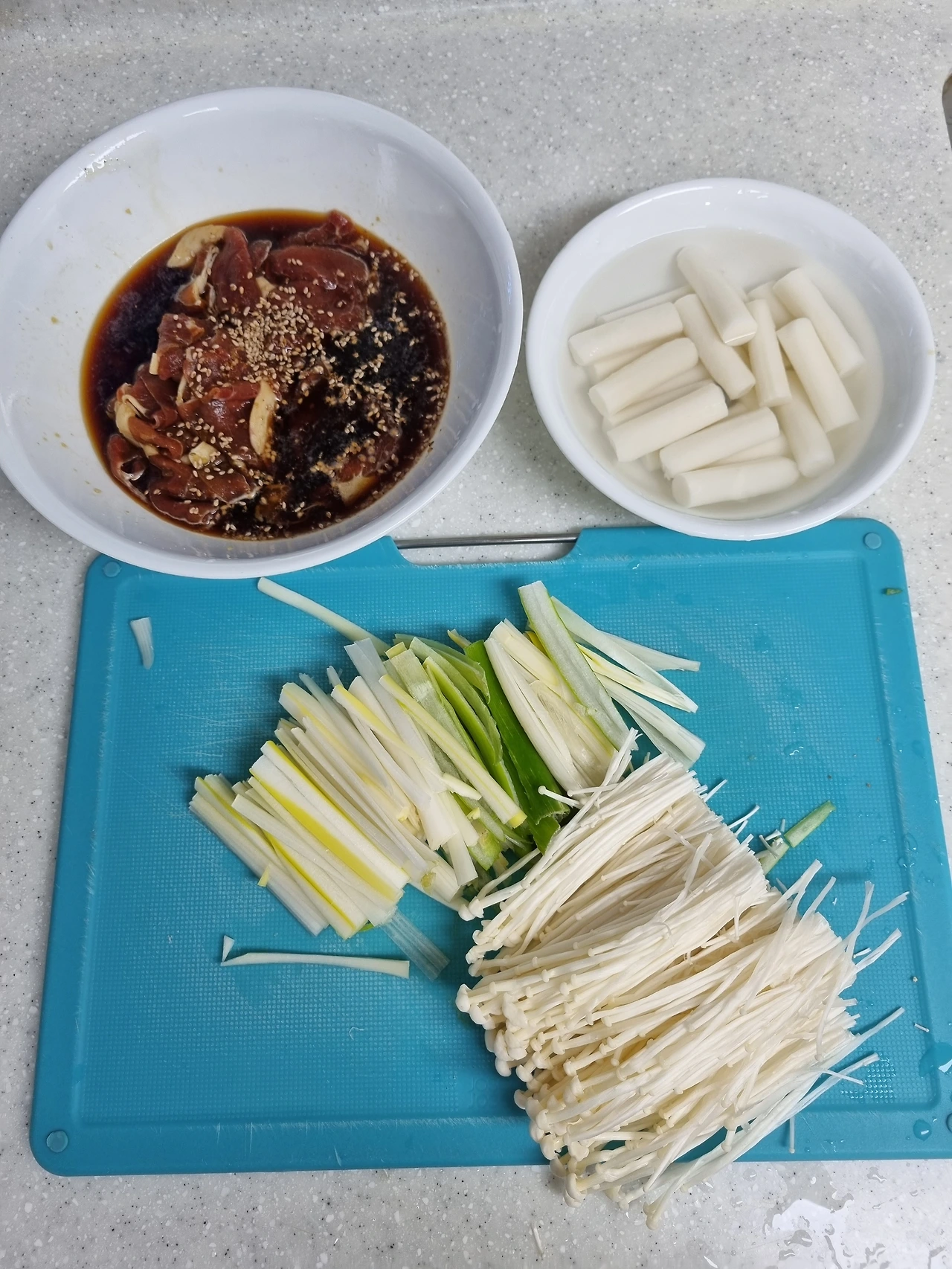 이제는 소고기를 좋아할 때도 되지 않았냐고 할 지모르지만 모르는 소리다. 여전히 돼지고기가 좋은 나는 소불고기는 냄새만 맡아도 자다가 깨는 남편을 위해서, 소고기 안 좋아하는 나를 위해서 꾀를 낸다. 소불고기 양념에 같이 버무린 떡볶이 떡을 먹겠다는 원대한 계획을 가지고 궁중 떡볶이를 아니 간장 떡볶이를 아니 불고기 떡볶이를 했다. 이 음식을 뭐라고 불러야 하나? 빨강도 파랑도 아니지만 어떤 이름도 어울리는 이 음식이야 말로 회색분자가 아닐까 싶지만 맛만 좋다면 뭐라고 부른 들 무슨 상관이냐 싶다. 나는 나 좋아하는 것 먹고, 너는 너 좋아하는 것 먹으면서 살게 해 줬으니 너의 이름을 뭐라고 부른 들 무슨 상관이냐 싶다. 그래도 혹시 시간이 나신다면... 이름을 지어주실래요?