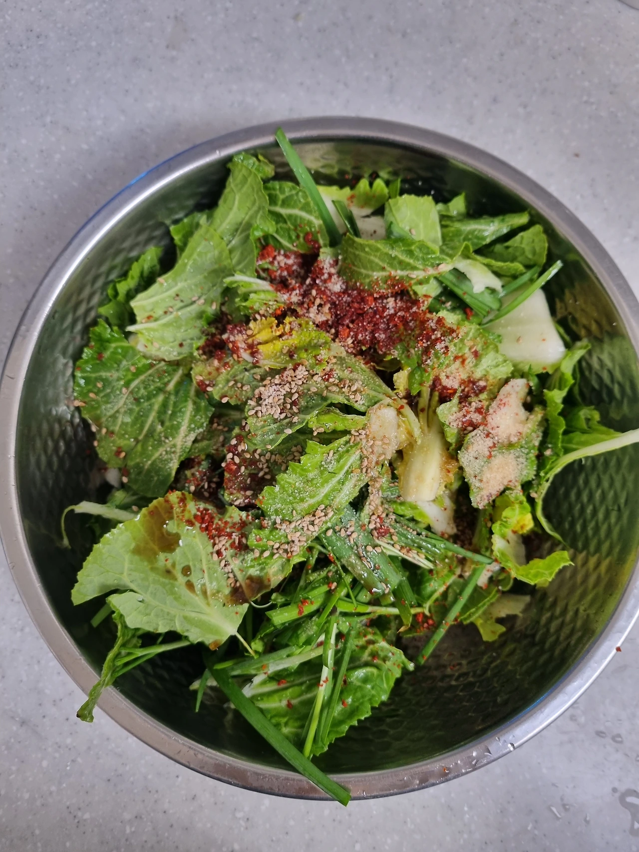 겨울초(동초)가 나오면 여리여리한 잎을 손으로 툭툭 뜯어서 새콤하게 겉절이 했다. 얼갈이가 맛있는 여름이면 한 단에 천 원에 사서 겉절이를 해서 바로 먹기도 하고 익혀 먹기도 했다. 그리고 겨울부터 나오는 겉절이를 봄동 했다. 달큼하고 아삭거리는 소리가 좋아서 봄동만 보이면 사 와서 무쳤다. 초벌부추가 보이면 그것도 사서 같이 무쳤다. 설탕도 넣고 식초도 가득 넣어서 살살 무쳐서 숨이 죽지 않은 상태로 먹으면 그 어떤 샐러드한테도 기죽지 않았다. 샐러드 선발대회가 있다면 진이겠구나 싶게 맛도 미모도 완벽했다.
