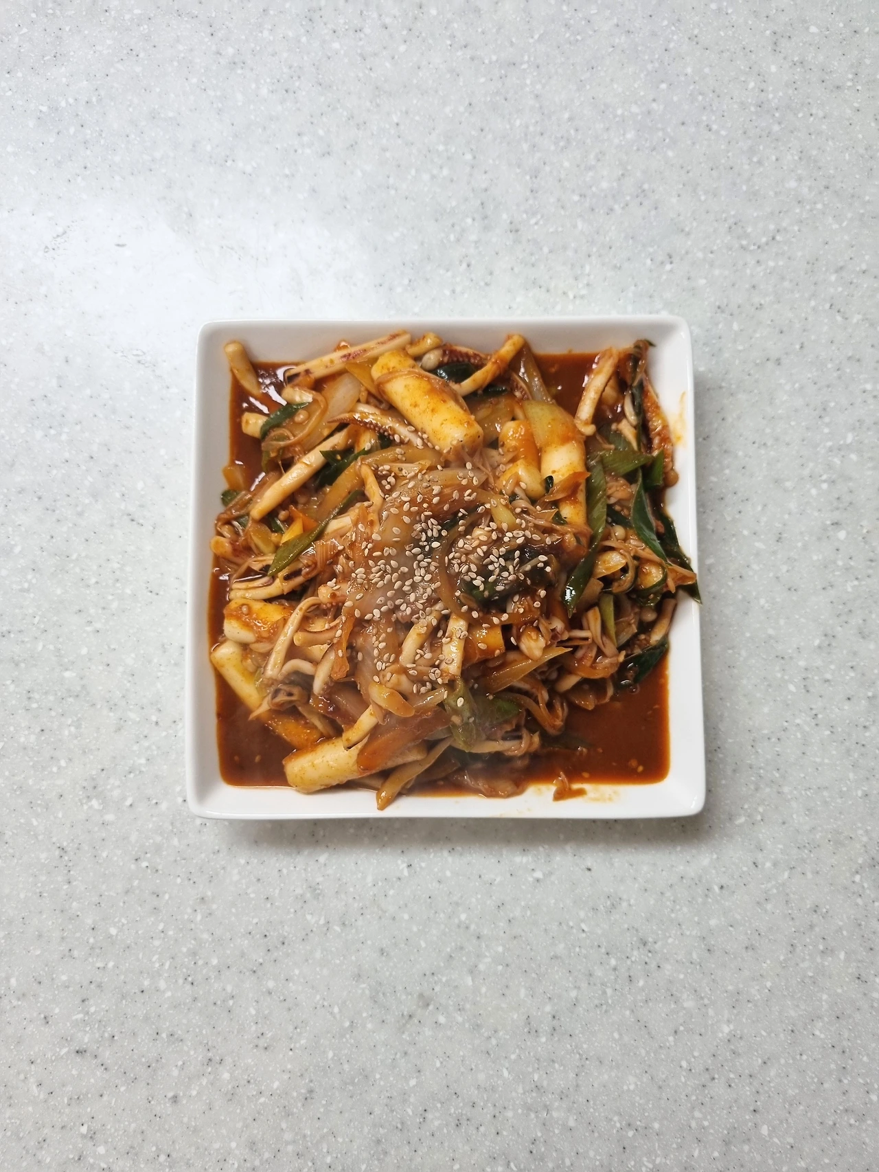 오징어를 두 마리 넣어라. 남을까 걱정 말고 두 마리 넣어라. 형편이 좋으면 세 마리 넣어라. 한 마리 넣고 맛없어서 버리는 것보단 맛있게 먹고 남아서 버리는 게 낫다. 고추장 간장 적당히 넣고 야채는 나중에 넣어라. 물이 많이 생기니까 나중에 넣으면 국물이 딱 맞게 된다. 맛있게 만들어진 오징어 볶음에 밥 한 그릇 뚝딱하면 된다.