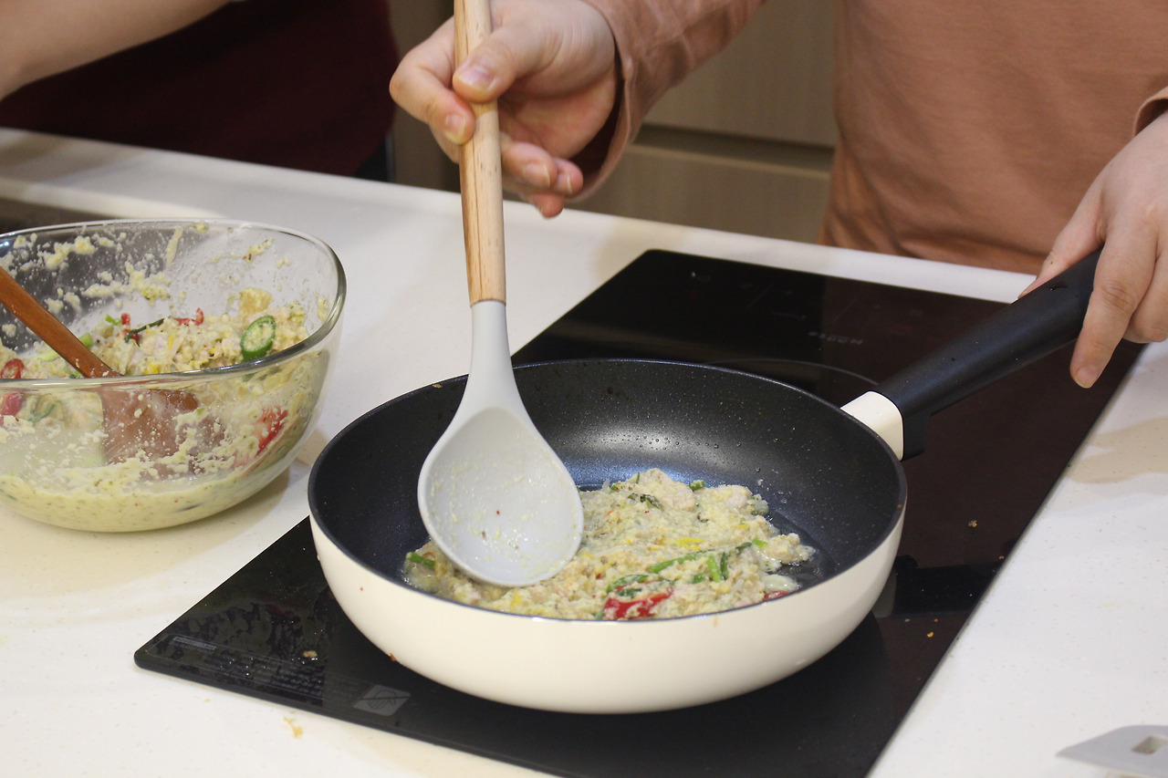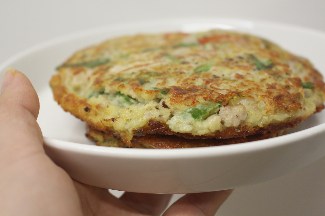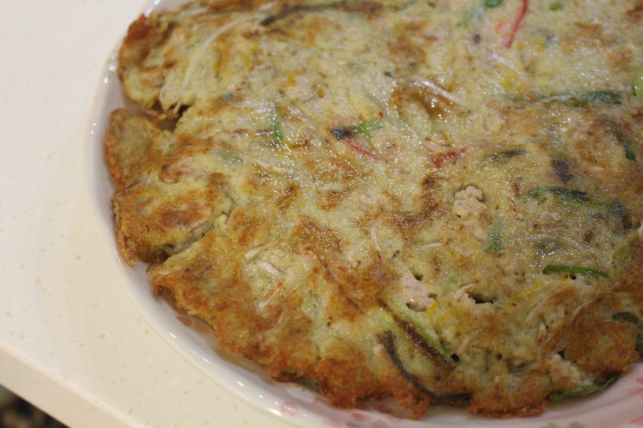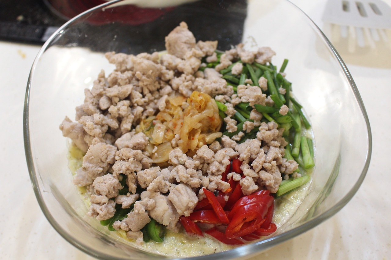 8. 기름 자작하게 예열된 팬에 7번 반죽을 도톰하게 올리고 지글지글 부쳐줍니다.
