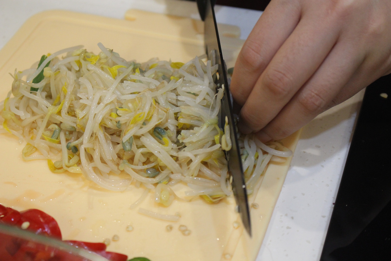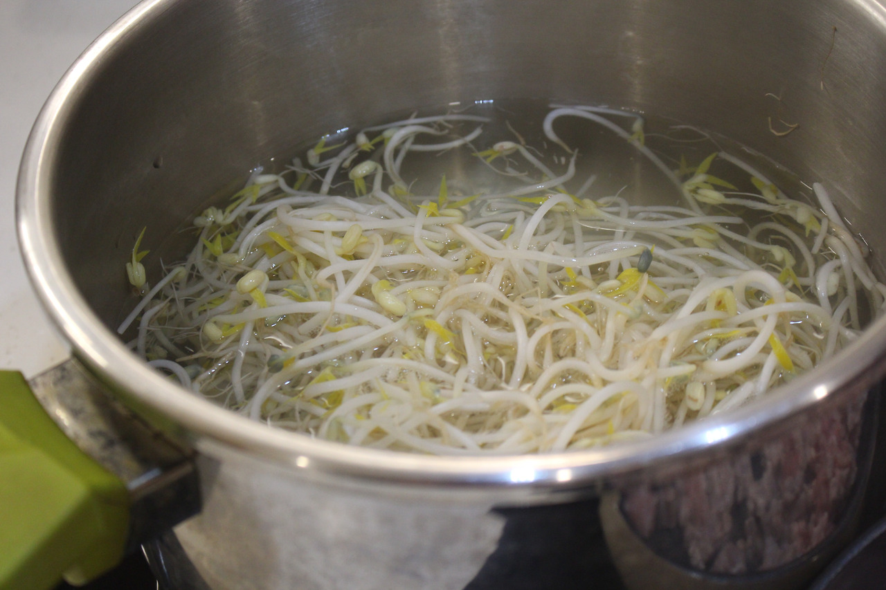 2. 숙주를 아삭하게 데쳐주고 먹기 좋게 한 입 크기로 썰어줍니다.