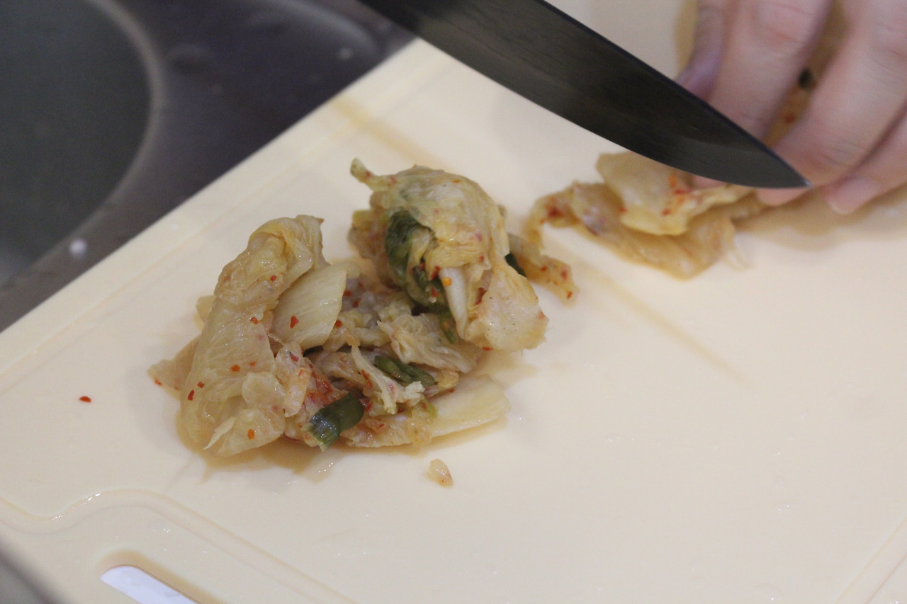 3. 잘 익은 김치를 씻어서 물기를 쫙- 뺸 후 쫑쫑 썰어줍니다.