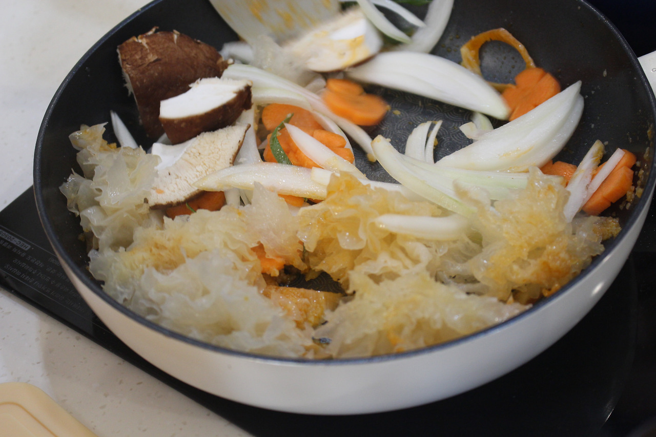 7. 양파, 당근, 대파를 채 썰어 볶아주고 목이버섯을 퐁당퐁당 넣어줍니다.