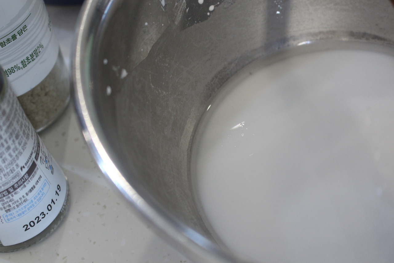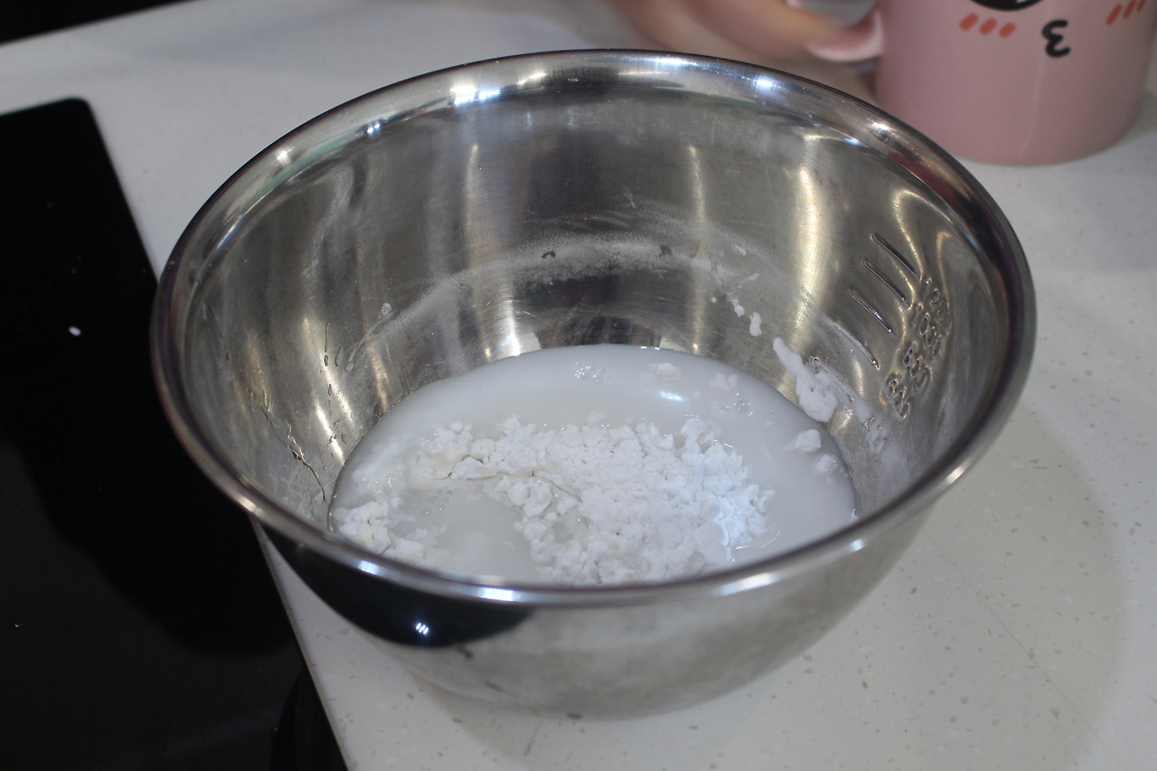 2. 전분에 물을 세 번에 걸쳐 넣어주며 튀김옷을 만들어줍니다. 30여 분간 놔두면 맑은 물이 떠요. 그 물은 버려주시고 남은 전분만 사용합니다.