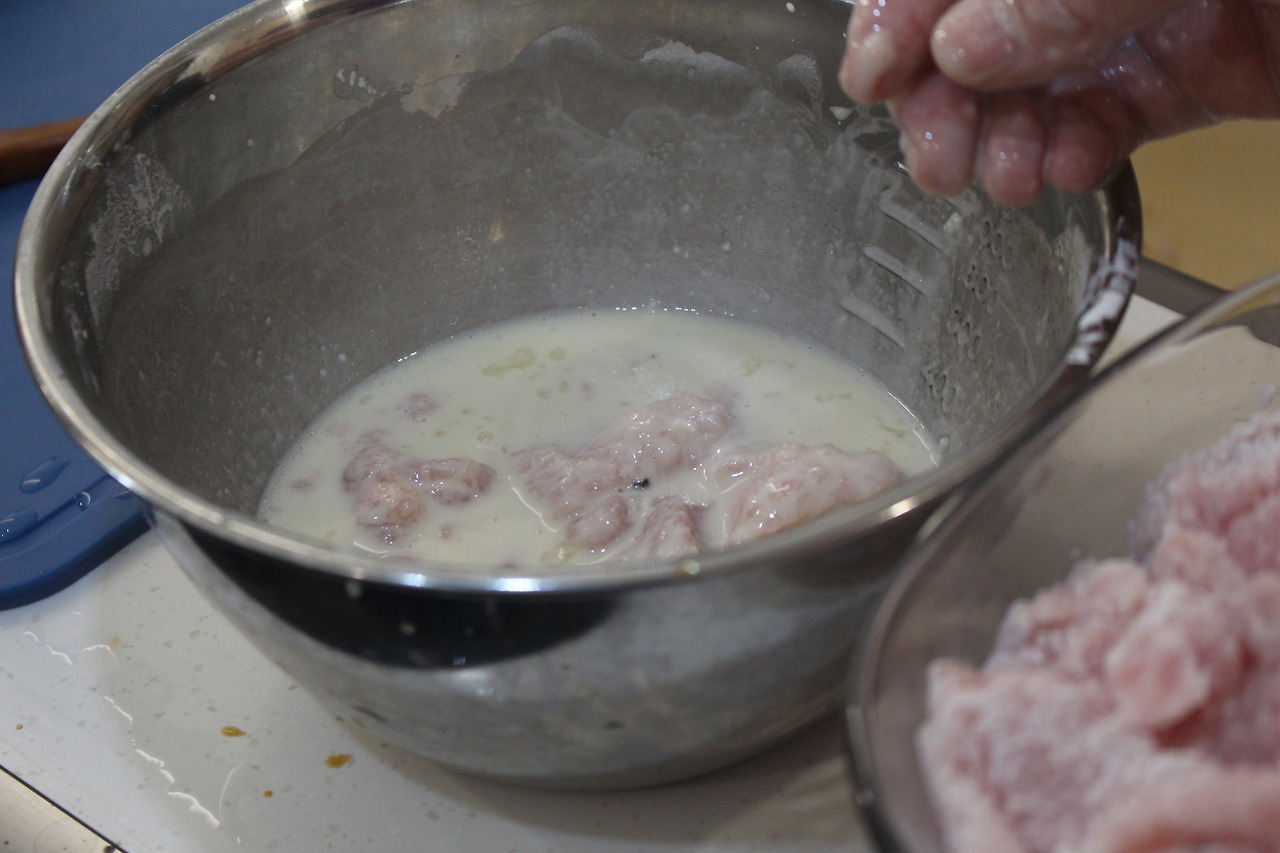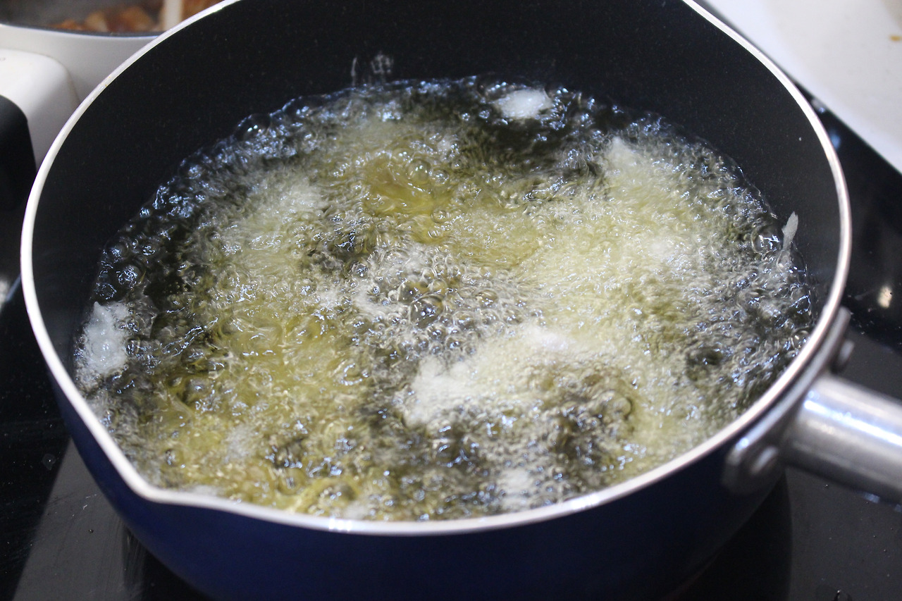 5. 튀김옷을 입혀 포도씨유에다 2번에 걸쳐 튀겨줍니다.