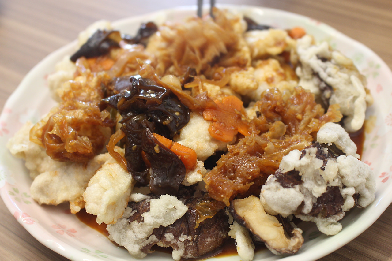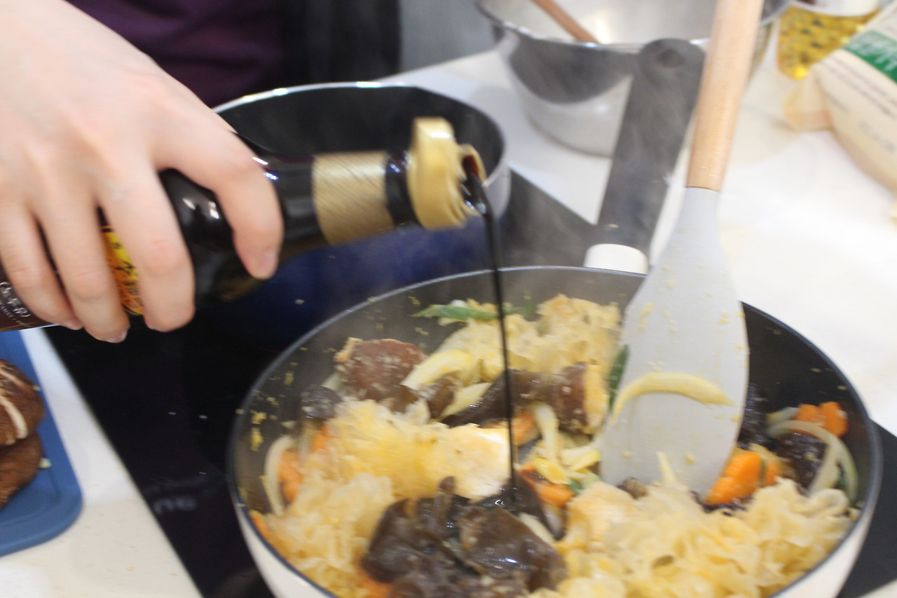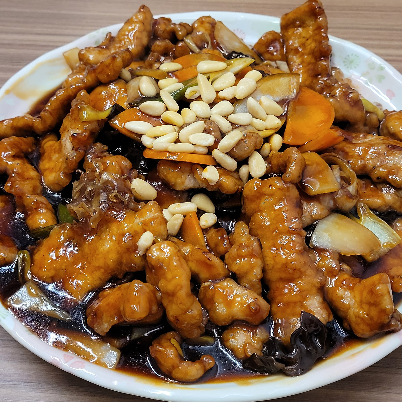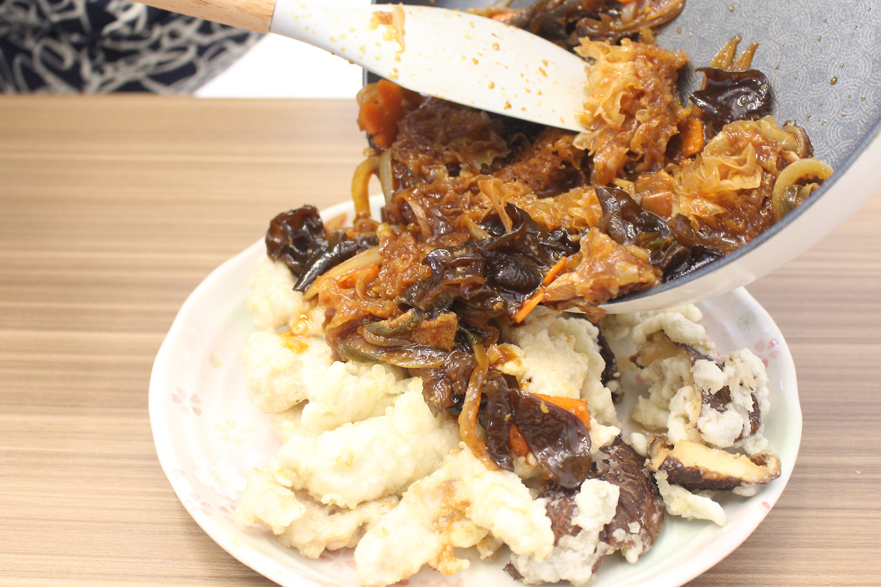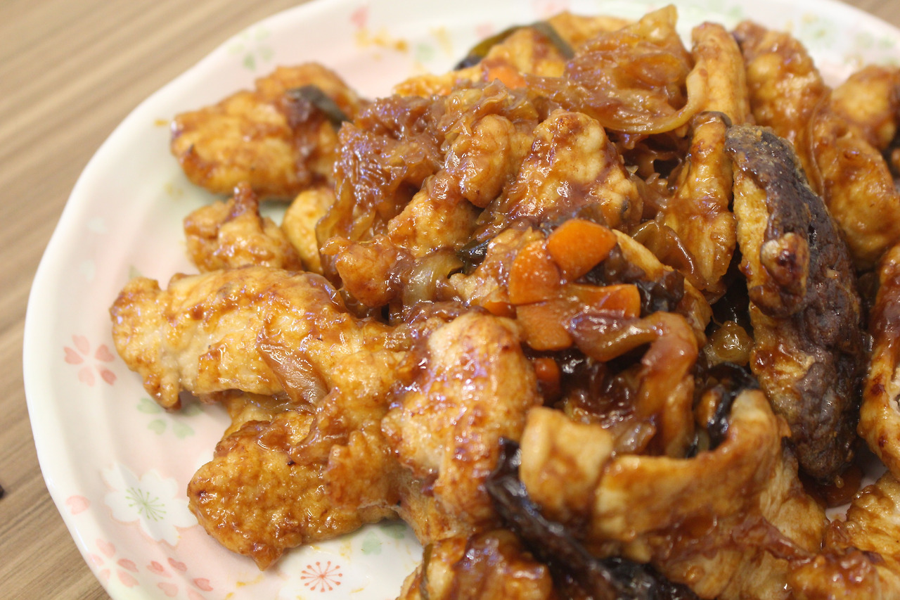 재료: 돼지고기 등심, 계란, 양파, 당근, 대파, 표고버섯, 목이버섯, 노추 간장, 찹쌀가루, 식초, 설탕, 다진 마늘, 고추기름, 전분, 포도씨유, 소금, 후추