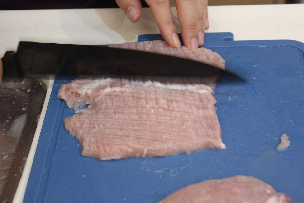 1. 한돈 등심은 키친타월에 핏물을 빼줍니다. 돈가스용 고기여서 좀 두꺼운 감이 있었어요. 칼등으로 얇게 두드린 후 저며줬습니다. 스트레스 해소에 와방 좋아요!