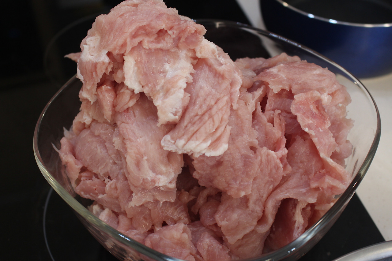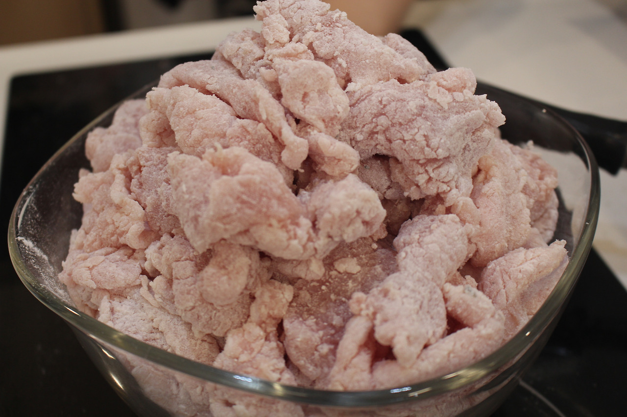 4. 돈등심에 소금, 후추 밑간 후 찹쌀가루를 얇게 입혀줍니다. 봉지에 찹쌀가루와 고기를 넣고 쉐킷 해주면 쉽게 만들 수 있습니다. 네 저것이 3근의 돼지고기 저민 것입니다.