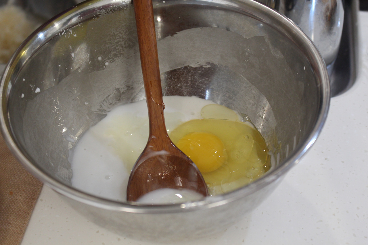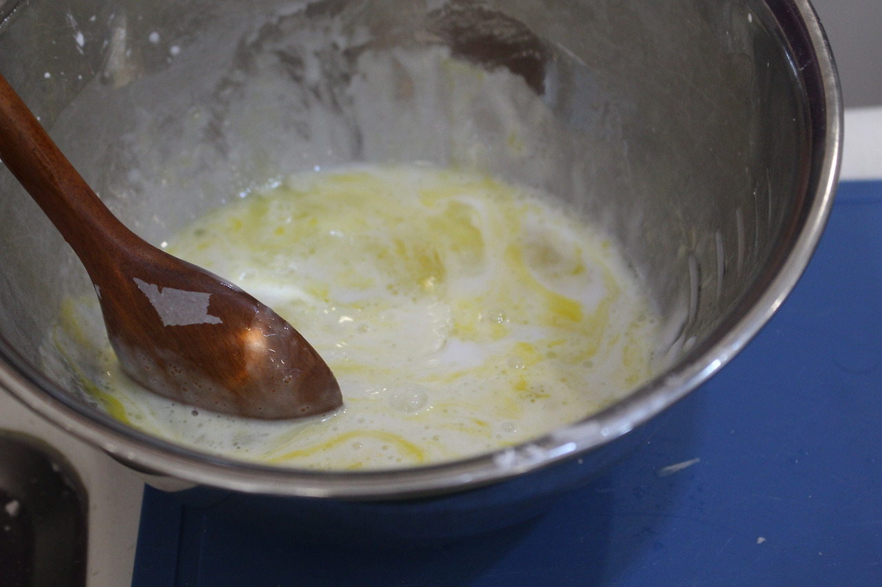 3. 식용유와 계란을 넣고 반죽해서 흐를 정도로 적당히 되직하게 튀김옷을 만들어 줍니다.