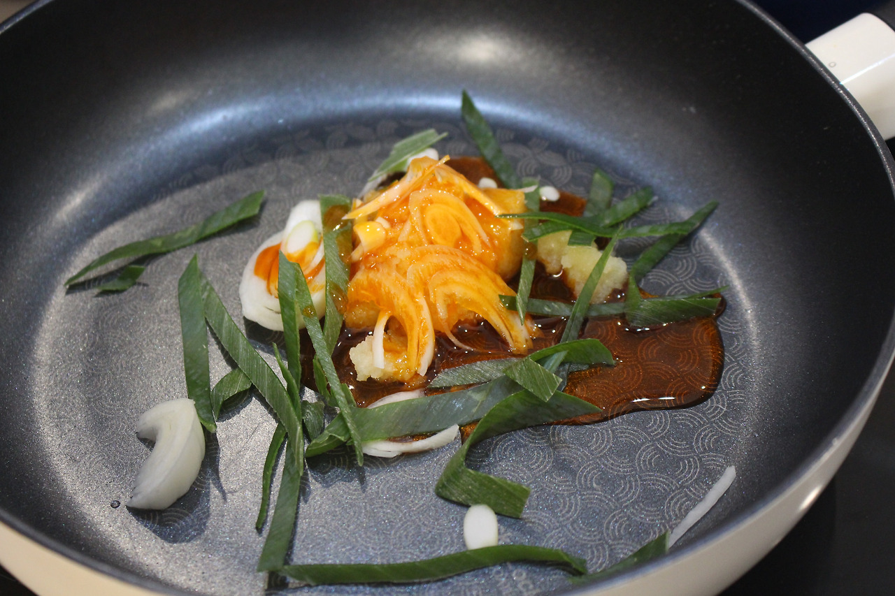 6. 다진 마늘과 대파, 고추기름으로 향을 냅니다.