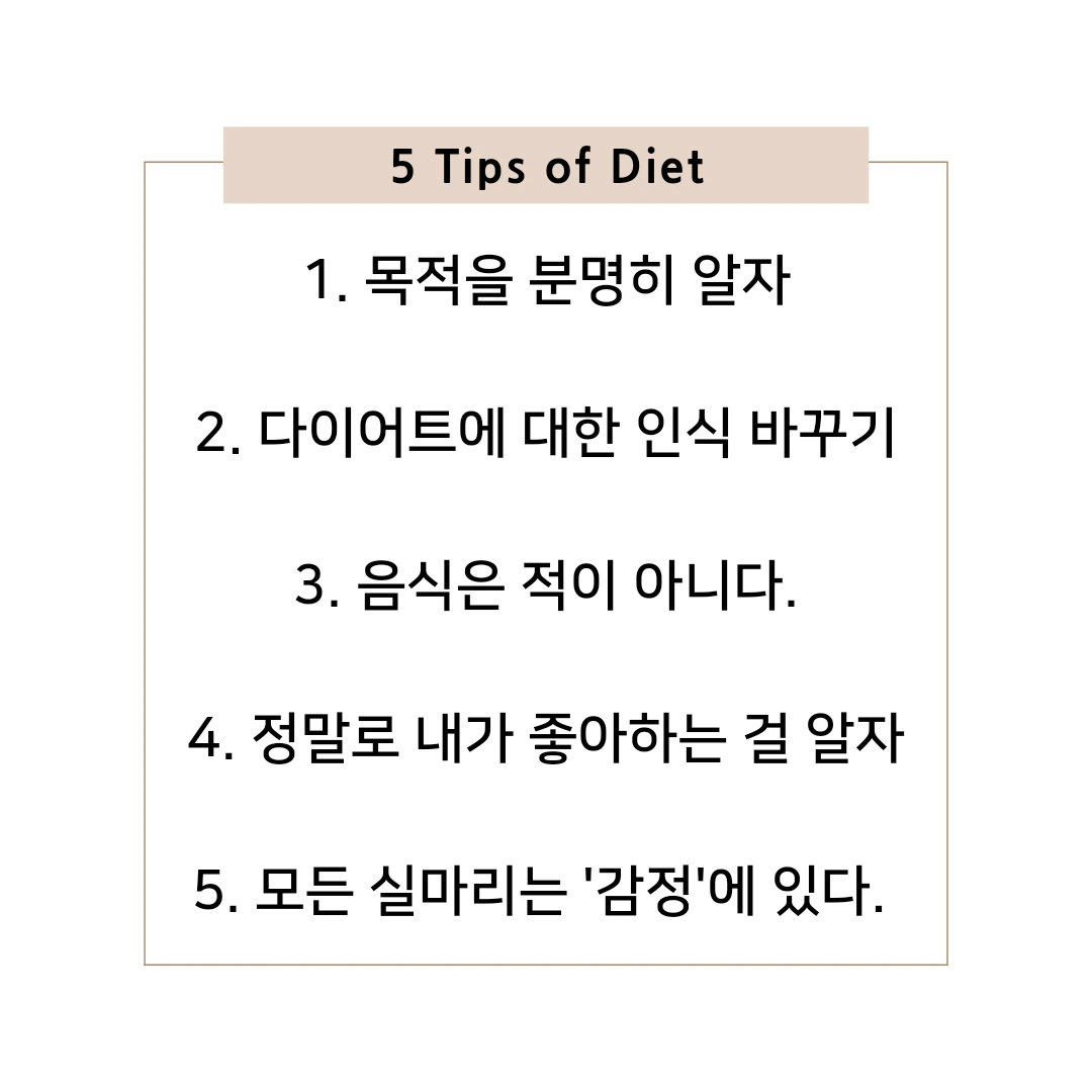 모든 일상의 초점이 다이어트에 맞춰져 있고, 체중에 대한 강박이 심하다면 그것은 나의 감정을 돌봐야 한다는 신호다. 억눌린 감정(열등감, 죄책감, 우울, 분노, 불안...)을 음식으로 해소하는 습관이 있는지, 계속 더 잘해야 된다고 완벽주의형으로 나를 몰아붙이진 않는지 되돌아보자. 미해결 된 감정을 만나 다독여주며 다이어트 없이도 있는 그대로의 나를 사랑하는 즐거움을 누려보자.