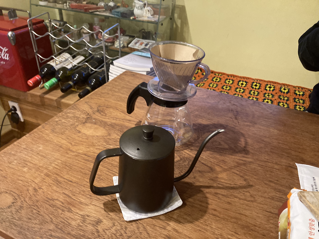 숙소에 도착하기 전에 카페에서 일몰을 보려고 했지만 시간이 애매해 숙소로 바로 갔었다. 커피를 못 마신 게 아쉬워 도착하고 난 뒤 가져온 팩으로 된 드립커피를 가지고 내려먹으려 했다. 사장님은 자신이 콩을 볶은 걸로 핸드드립을 해 주겠다고 했다. 신경 써주시는 것이 감사해 가져온 드립커피를 드리고 우리는 사장님 표 핸드드립을 마셨다.