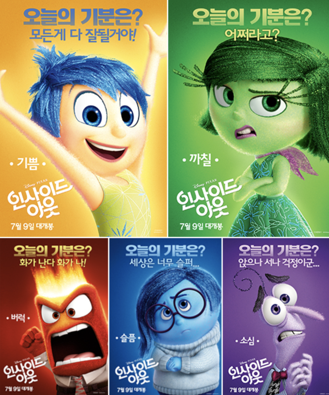 '인사이드 아웃'에는 모든 사람의 머릿속에 감정 컨트롤 본부가 있다고 나온다. 그 본부에는 다섯 가지의 감정이 있는데 위의 다섯 캐릭터가 라일리라는 주인공의 감정을 담당한다. 사람에게 생성된 기억은 다섯 색깔 중 한 가지가 되어 본부로 들어온다.