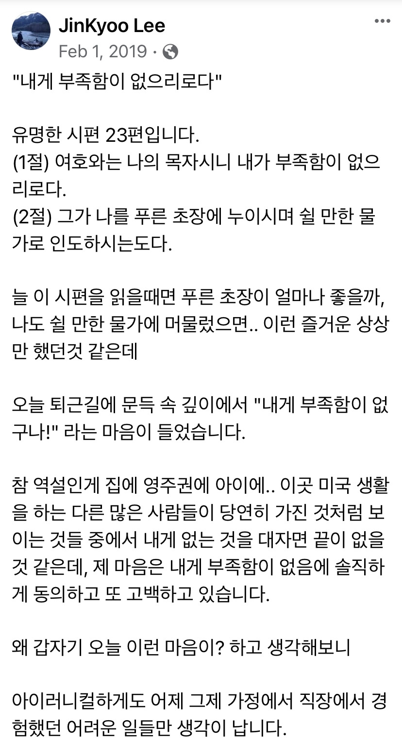 이때, 제가 예전에 시편 23편을 묵상하면서 페이스북에 썼던 글이 생각났습니다. 내게 부족함이 없다고 문득 깨닫고 고백하는 글이었던 것 같은데, 그때 어떤 마음이었는지 다시 한번 보고 싶었습니다.