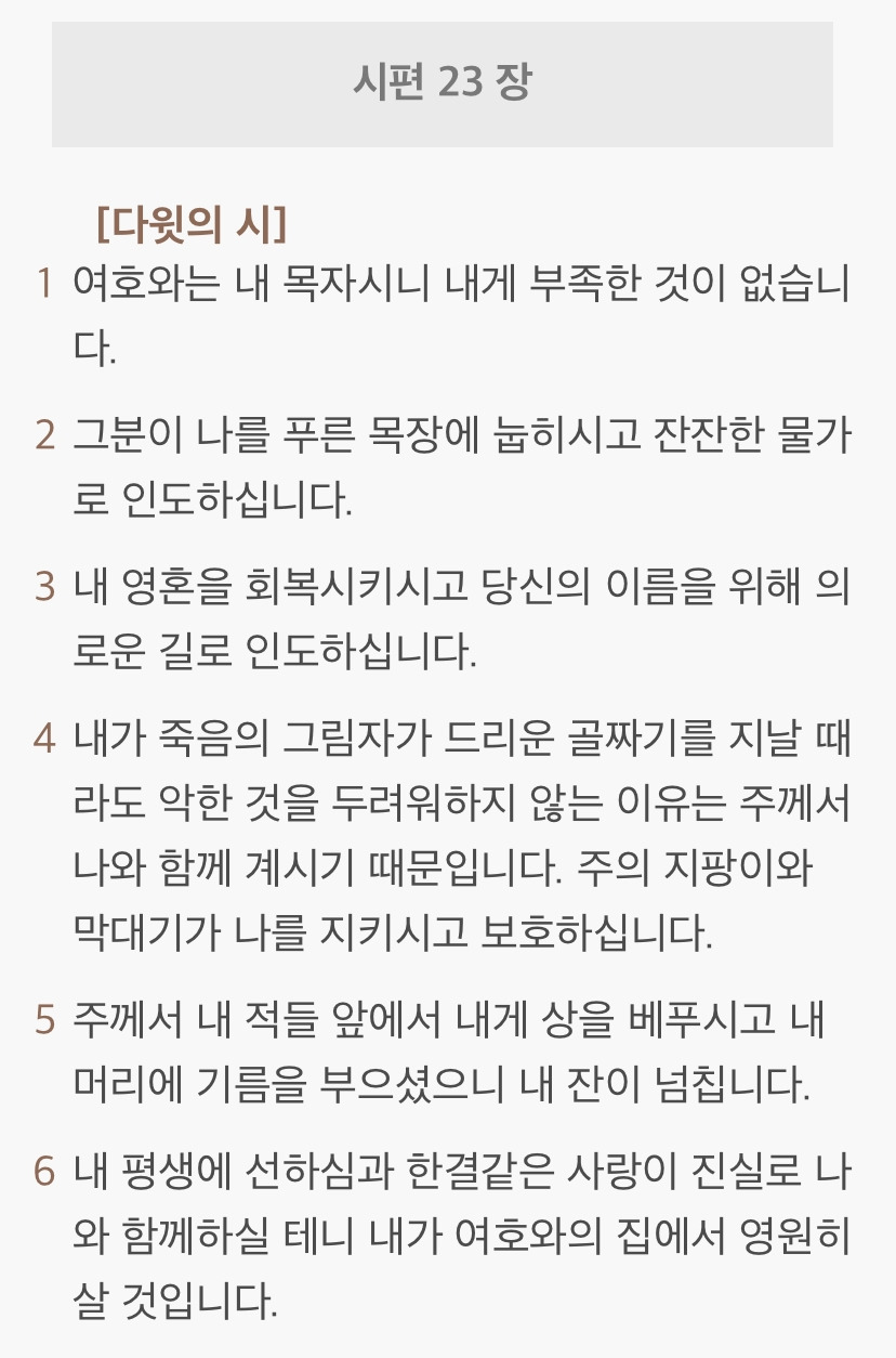 그중에서도 시편 23편은 가장 많이 알려진 시가 아닐까 합니다. 평안과 평화의 대명사인 이 시편은 상상만 해도 마음이 포근해지고 든든해집니다.