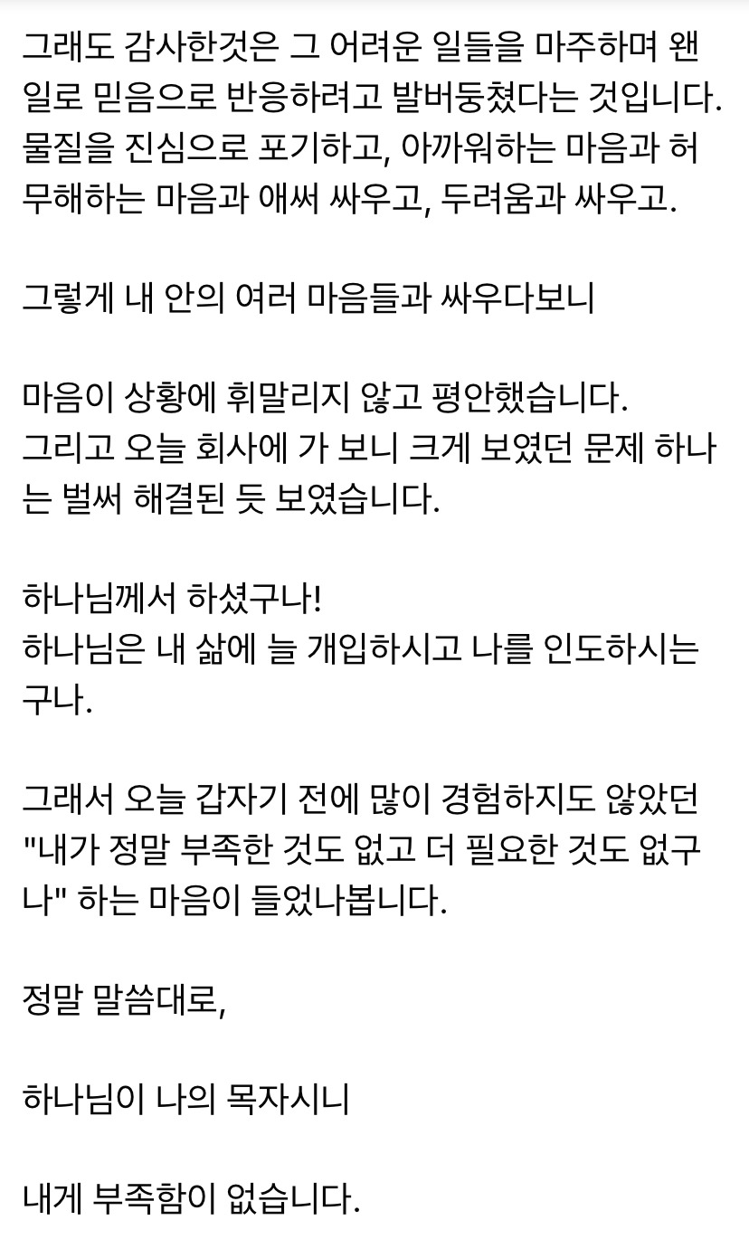 내 바람들이 내가 원하는 타이밍에 내가 원하는 방식으로 이루어지지 않았더라도 내 삶에 부족함이 없다는 고백은 가능한 일이었습니다. 그 마음을 많은 순간 잊고 살긴하지만, 여전히 변함없이 하나님은 나의 목자이시기 때문에 그 부족함과 결핍이 나에게 중요하지 않게 인정되는 마음이 정말로 가능했습니다.