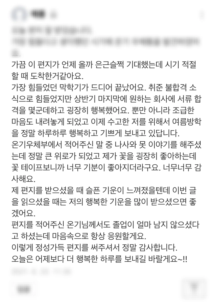 코로나가 심했던 기간 동안 한국에서 잘 먹고, 잘 놀고, 잘 일한 나날을 뒤로하고 미국에 돌아가 졸업할 채비를 할 때였다. 당시 나는 '온기우편함'이라는 비영리단체에서 봉사를 하고 있었는데, 이름 모르시는 분들이 적어주신 고민편지에 답장을 하는 내용이었다. 영화 '레터스 투 줄리엣'이나 소설 '나미야 잡화점의 기적'에서처럼 말이다.