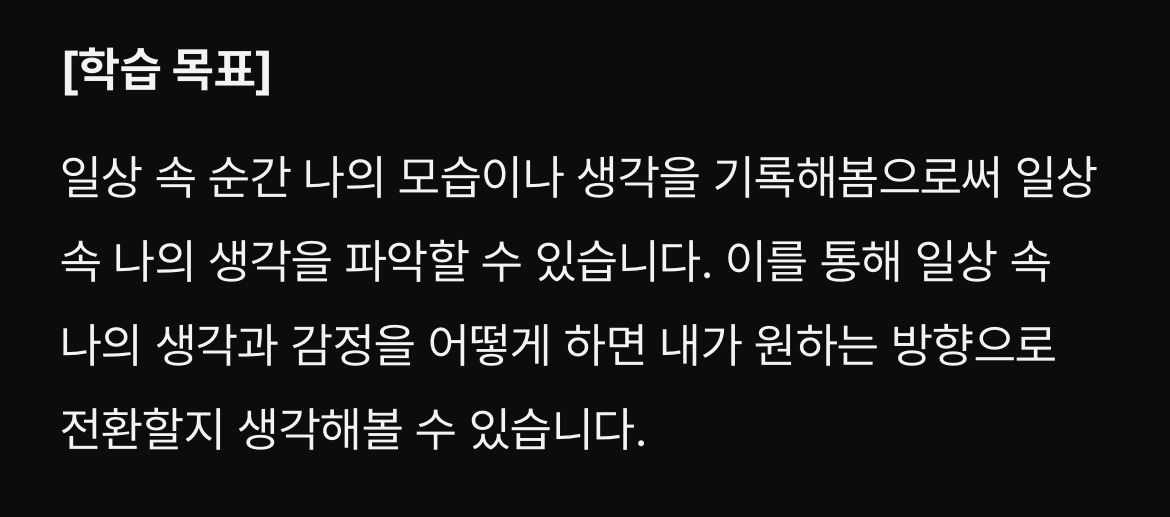 제작 PD님이 학습 목표를 작성해 달라고 하셨을 때 저는 ‘나 자신의 장점에 대해 알 수 있어요!’라는 식의 문장을 적었어요. 그랬더니 PD님께서 ‘그걸 함으로써 좋은 게 뭔지‘까지를 적어달라고 하셨어요. 이를테면 ‘나 자신의 장점을 생각해 봄으로써 일상 속에서 자신감을 얻을 수 있습니다’라는 식이었죠.