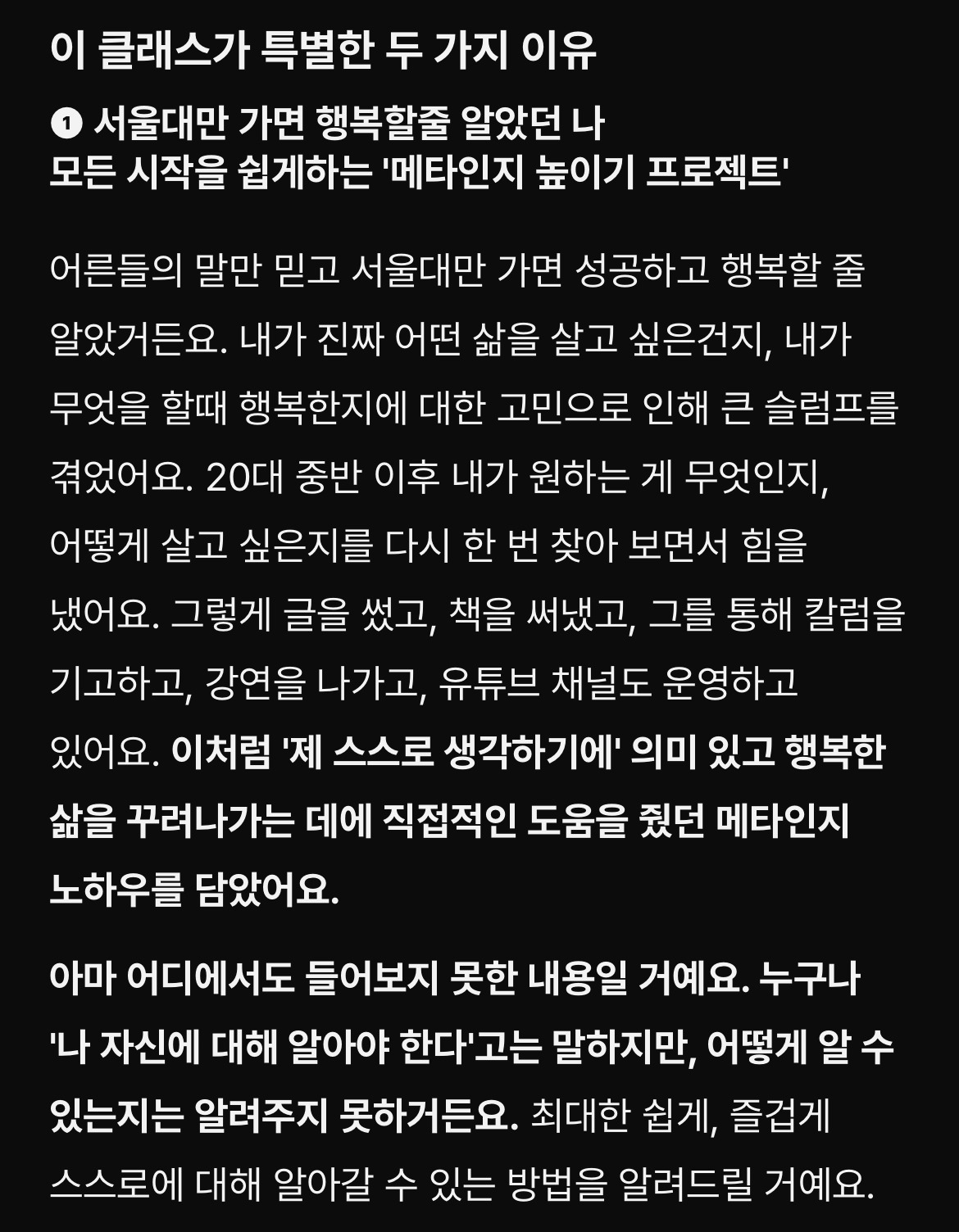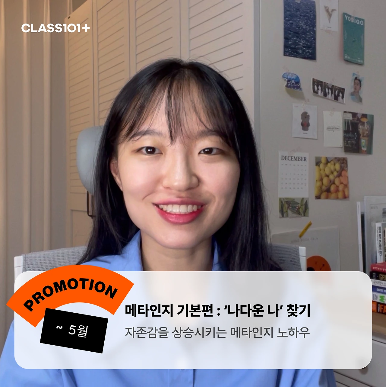아무튼 제 자신에 대한 메타인지와 함께 저의 메타인지 클래스가 오픈되었습니다! 제가 제 스스로를 찾기 위해 헤맸던 시간들 속에서 발견한 자구책을 열심히 담아보았어요. 메타인지 클래스를 통해 나다움을 발견하고 내가 원하는 미래, 그 미래를 위해 내가 지금 당장 해야 할 일을 찾으실 수 있을 거예요.