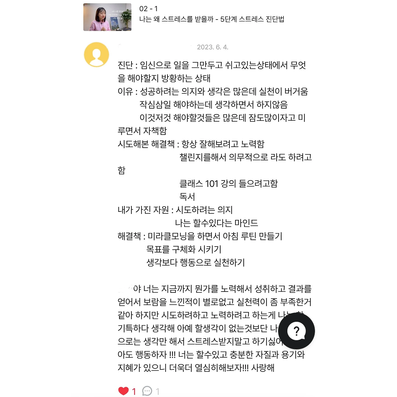 오늘은 ‘5단계 스트레스 진단법 클래스’에 댓글이 달렸습니다. 나의 가장 큰 스트레스를 진단하고, 그 원인을 찾고, 지금까지 시도해 본 해결책을 적어보고, 내가 가진 자원이 무엇인지 다시 나로부터 힌트를 얻고, 다시 한번 해결책을 찾아보는 것입니다. 실제로 제가 했던 방법을 개념화한 것입니다. 아침에 일어나서 댓글을 읽고 댓글을 달면서 마치 몇 년 전의 제가 느꼈던 힘든 마음이 다시 느껴지는 것 같았습니다.