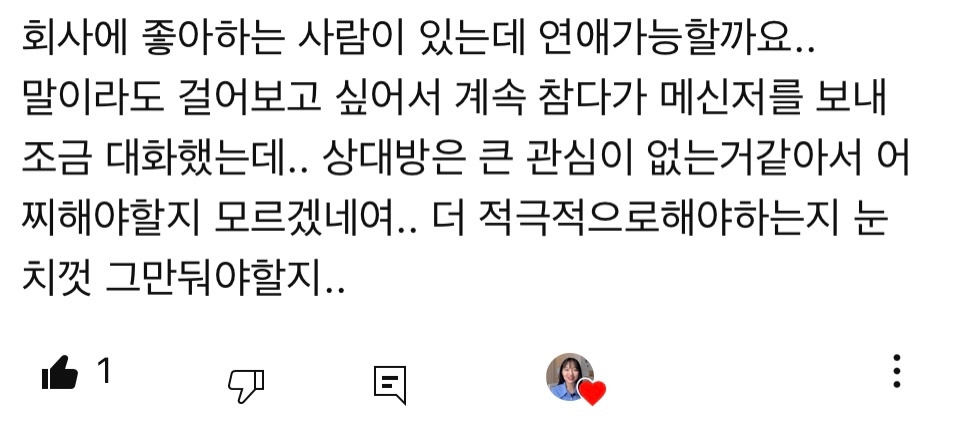 이게 회사라는 특수성이 있기 때문에 혹시라도 내가 마음을 주체를 못 해서 마음을 내비쳤다가 까인다면, 이후에는 정말 깔끔하게 포기를 하시는 게 좋습니다. 마음을 보일 때는 상대가 부담을 안 느끼게 말의 내용에 장치를 달아두시고요.