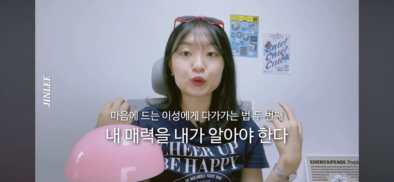 두 번째는 내 매력을 내가 안다. 내가 착한 게 매력인지, 잘생긴 게 매력인지, 그렇다면 무슨 행동으로부터 그런 게 나오는 건지를 알 필요가 있어요. 물론 안다고 해서 그 행동을 이성 앞에서 하라는 건 아니고요. 알고 있으면 그게 더 은근히 자주 나오게 되어 있는 거 같아요. 좀 더 자신감 있게 되고요. 단점을 생각하기보다는 장점을 좀 더 살리는 쪽으로 행동하는 게 좋습니다. 단점도 단점 나름이긴 한데, 보편적인 정서에 어긋나는 정도가 아니라면 단점은 장점으로 가릴 수 있습니다.