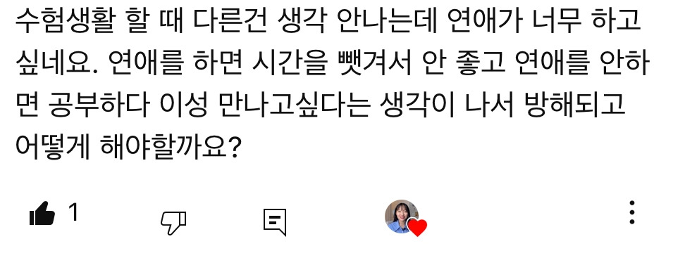 이 댓글 중에 또 하나의 포인트는 ‘이성 만나고 싶다는 생각이 나서 방해된다’인데 두 가지인 것 같아요. 단지 연애가 엄청 해보고 싶다, 궁금하다 하는 것 하나와, 이미 마음에 드는 이성이 있다.