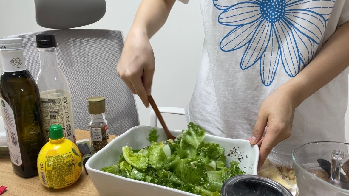 풀은 역시나 B마트에서 시저 샐러드용으로 포장된 것을 구매했습니다. 로메인, 바질 대신 쓴 건데요. 아무래도 부드러운 잎채소들이 어울리는 샐러드예요. 식초에 담갔다가 채반에 받쳐 물을 빼서 드레싱과 함께 섞어주었어요.