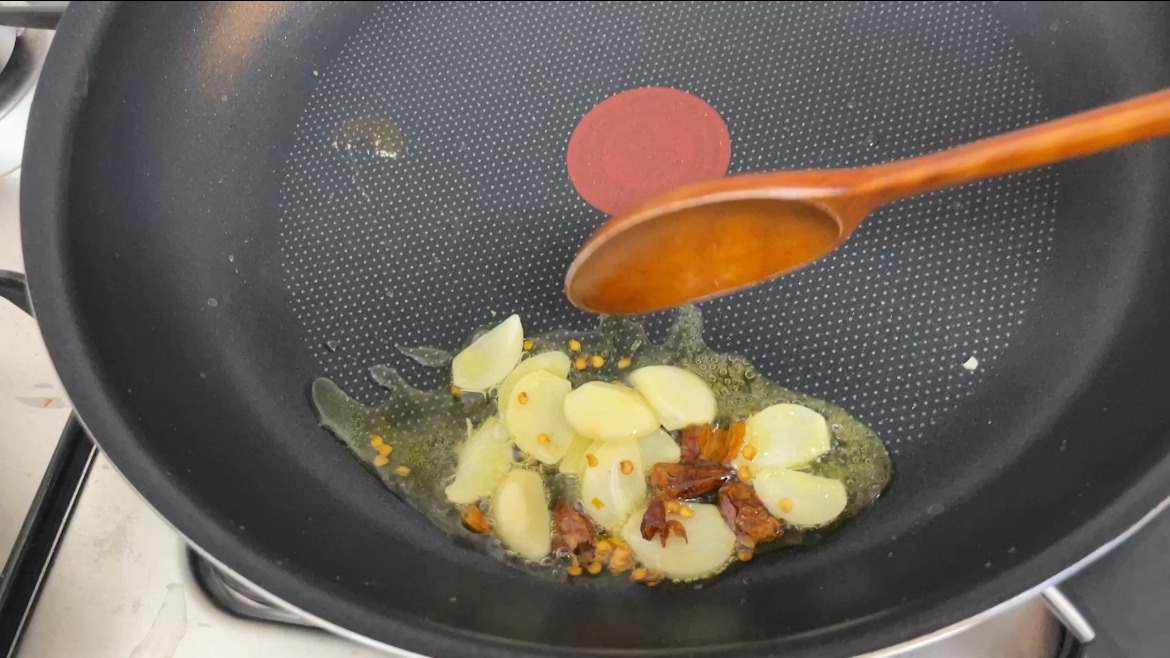 편으로 썬 마늘 두 알, 페퍼론치노 원하는 만큼을 쪼개어 올리브유에 볶아줍니다. 저는 알싸한 매운맛을 좋아해서 4-5 피스를 쪼개어 넣었어요. 이 이상 넣으면 매운맛이 파스타 맛을 압도해 버릴 것 같긴 합니다. 볶는 건 마늘이 살짝 노르스름한 색을 띨 때까지요.