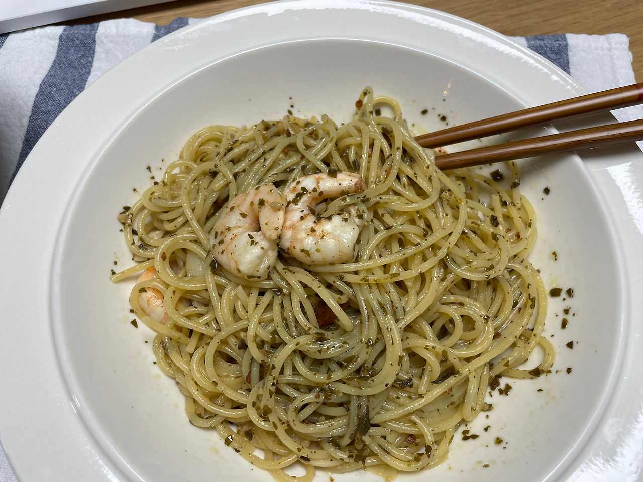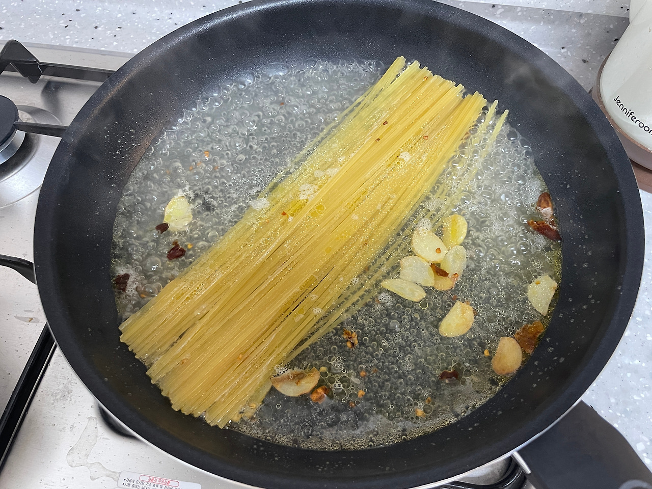 그리고 그 팬에 그대로 물을 1인분 기준 300ml를 부어줍니다. 파스타면도 1인분 넣어주시고요. 팬이 넓으니 파스타 끝이 고개를 빼꼼 내밀어서 타고 말 걱정은 하지 않아도 되겠어요. 8분 정도 익혀줍니다. 새우는 너무 익으면 질겨지는데, 냉동되었던 칵테일 새우를 기준으로 면을 익히기 시작하고 3분 정도 있다가 같이 넣어주면 될 거 같아요. 면수가 두 숟갈 정도 남은 상태에서 불을 끕니다.