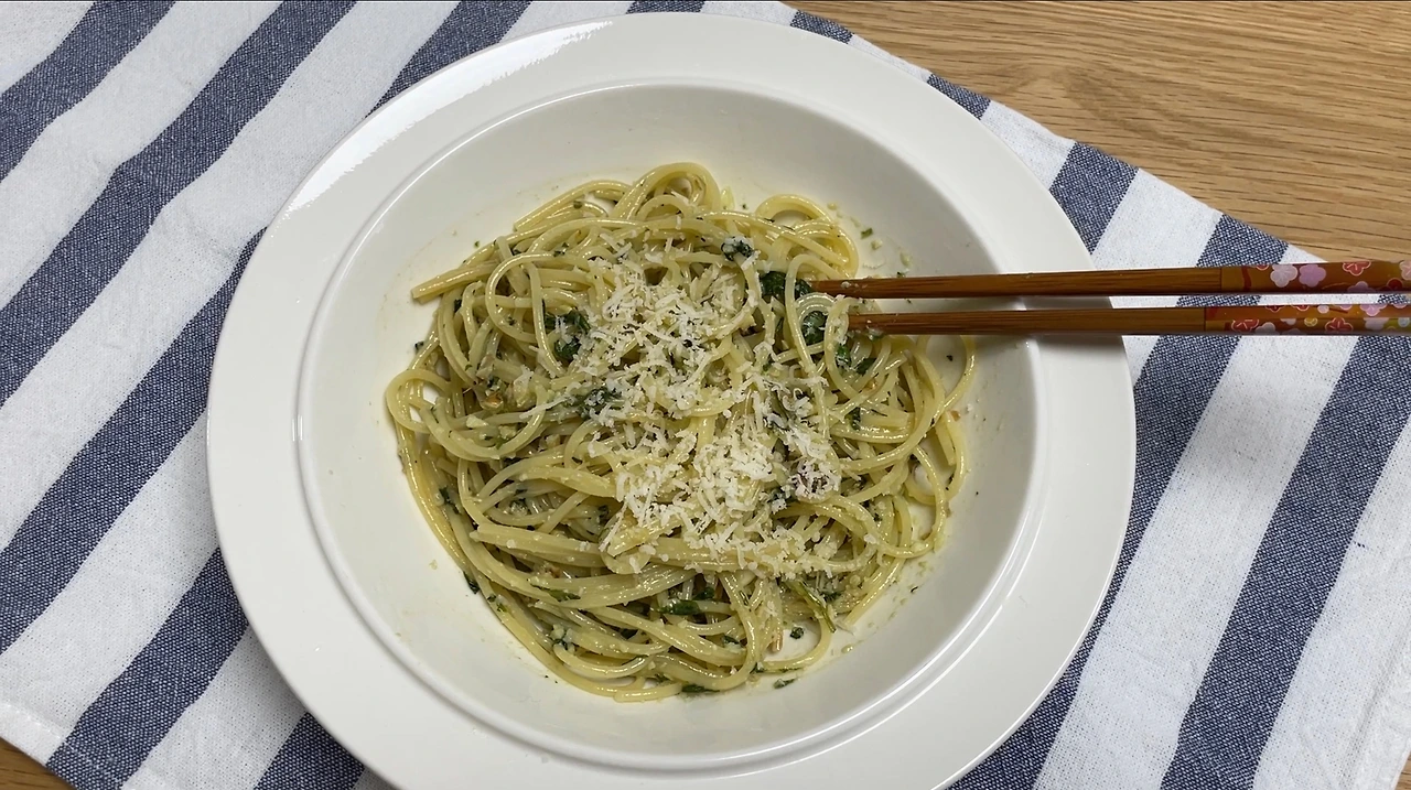 짠! 그레이터로 치즈를 한 번 더 갈아주면 신선한 바질 페스토 파스타 완성이에요! 고기, 새우, 해물 등이 들어가지 않은 순도 높은 파스타입니다.