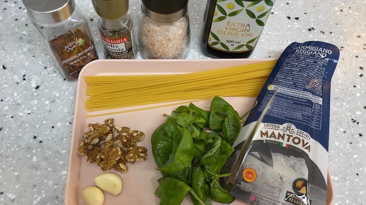 전통적인 바질 페스토 레시피를 찾아보니 잣과 페코리노를 쓰더라고요. 하지만 오늘도 집에는 그것들이 없었기 때문에 있는 재료로만 만들어 봤습니다. 제가 쓴 재료부터 소개할게요.