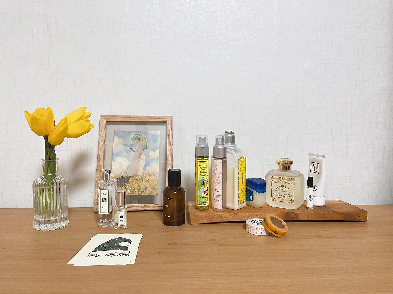 기다란 직사각형 모양의 도마는 친한 언니가 생일 때 줬던 선물입니다. 원래 도마 플레이트로 예쁘게 음식을 해 먹을 때 요긴하게 썼는데, 향수나 핸드크림과 함께 두니 꽤 어울리는 느낌이라 인테리어 소품으로 잘 활용하고 있습니다.