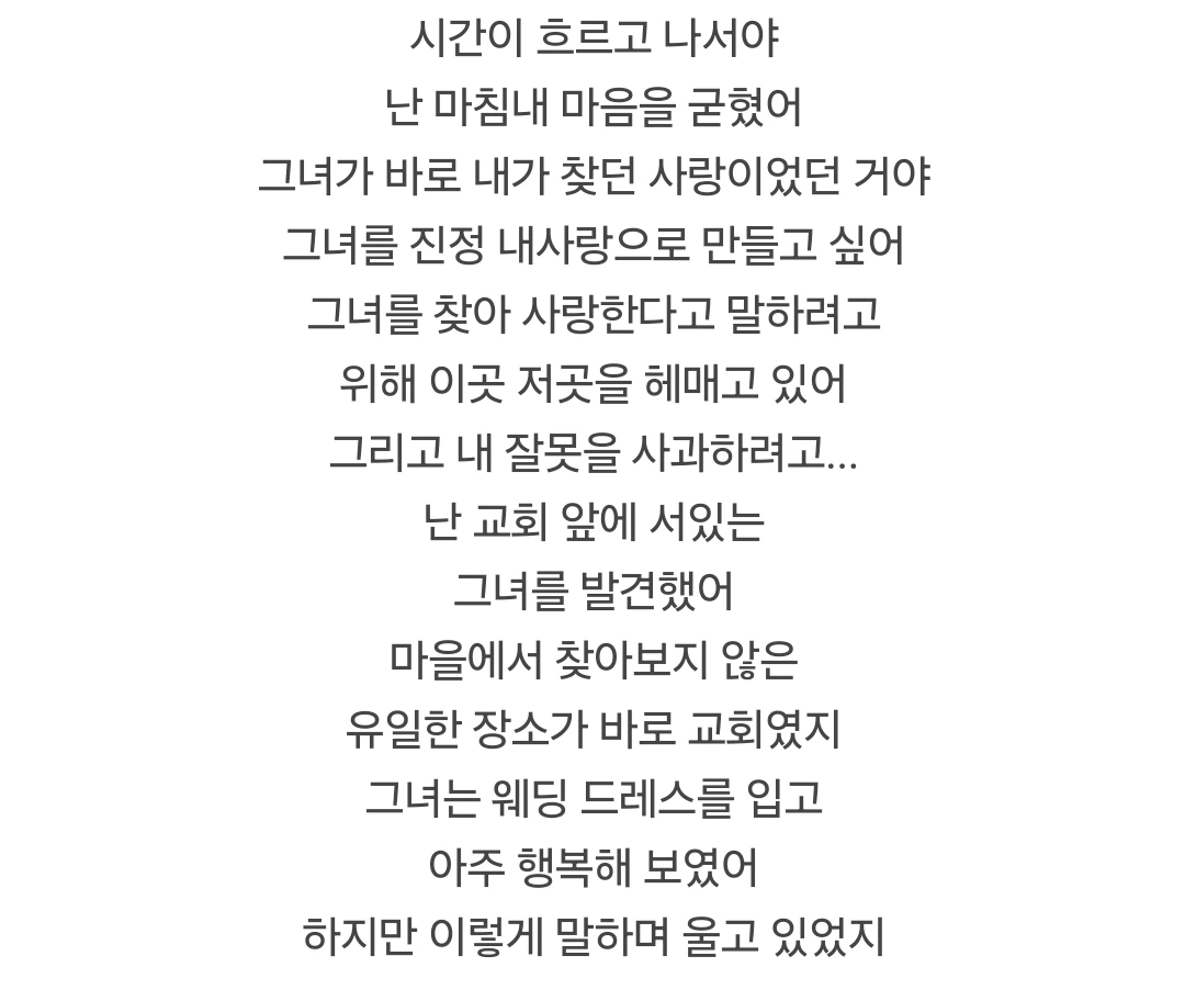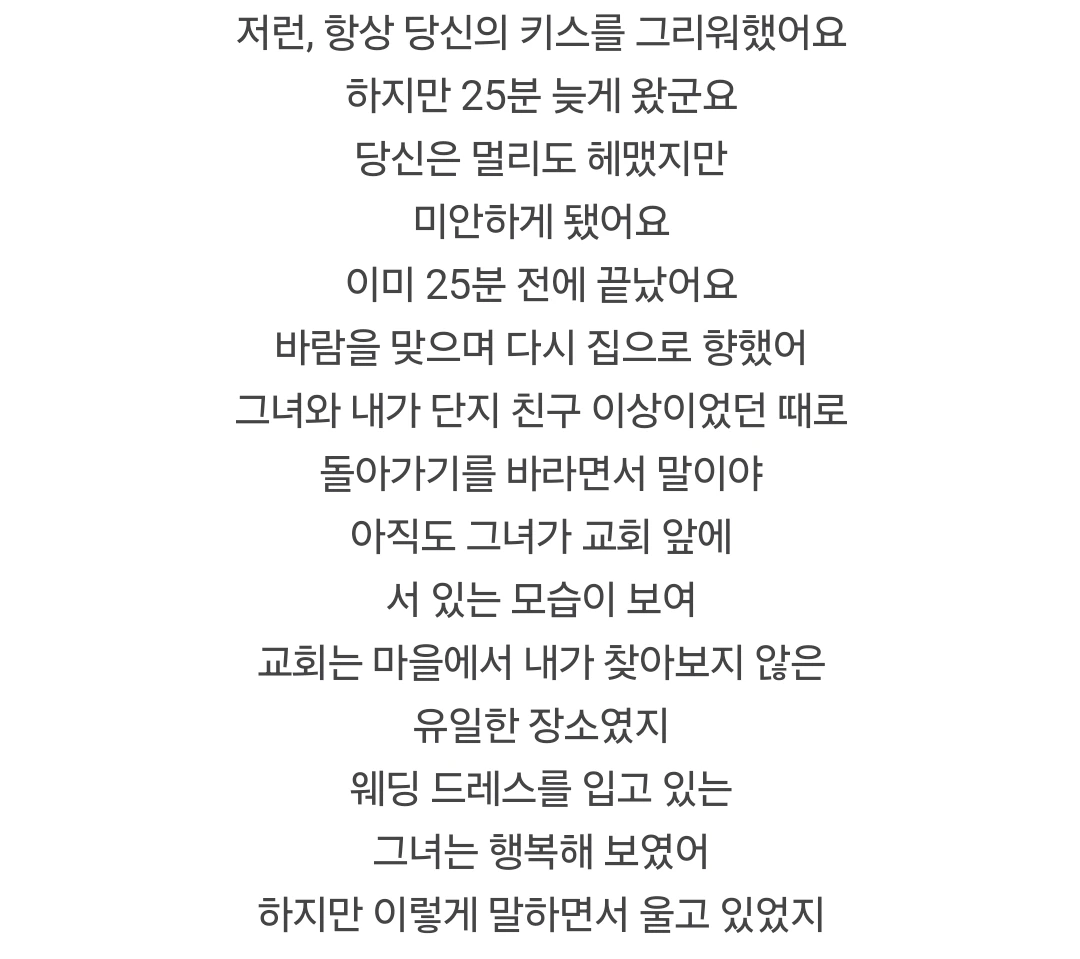은은한 피아노 선율에 올려진 남자 가수의 목소리는 처음에는 무심한 듯, 뒤로 갈수록 애절했다. 한번 쭉 듣고 한 줄, 한 즐 듣고 해석 시작. 이 노래의 내용은 사랑하는 여자에게 늦게 도착한 한 남자의 회한이 서린 것이었다.